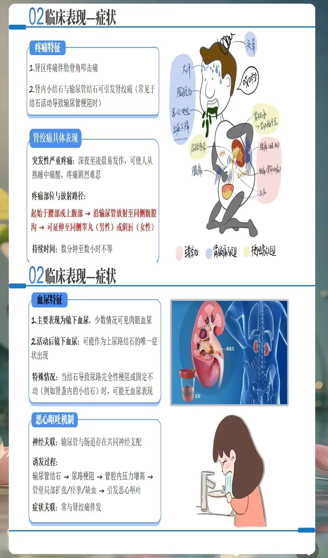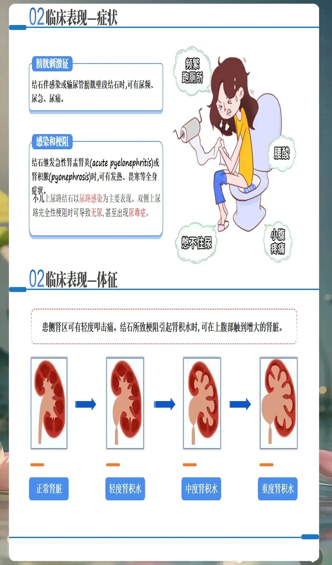 肾积水是结石梗阻的严重后果,表现为腰痛加剧、肾区叩痛、尿量减少等。护士应密切观察患者腰部症状和尿量变化,定期复查超声,评估肾积水程度。严重肾积水可能导致肾功能不可逆损害,必须及时解除梗阻。