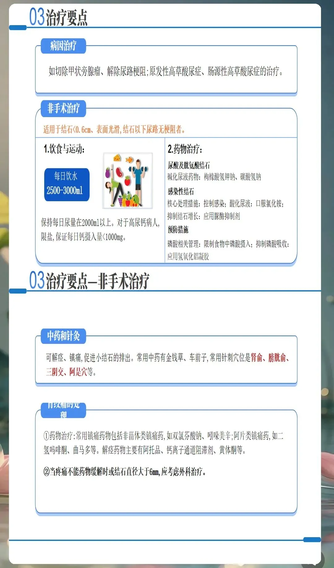 液体管理是泌尿系结石护理的核心环节,目的是通过增加尿量促进结石排出,同时预防尿路感染和肾功能损害。液体管理应根据患者的年龄、心功能、结石部位等因素个体化制定。