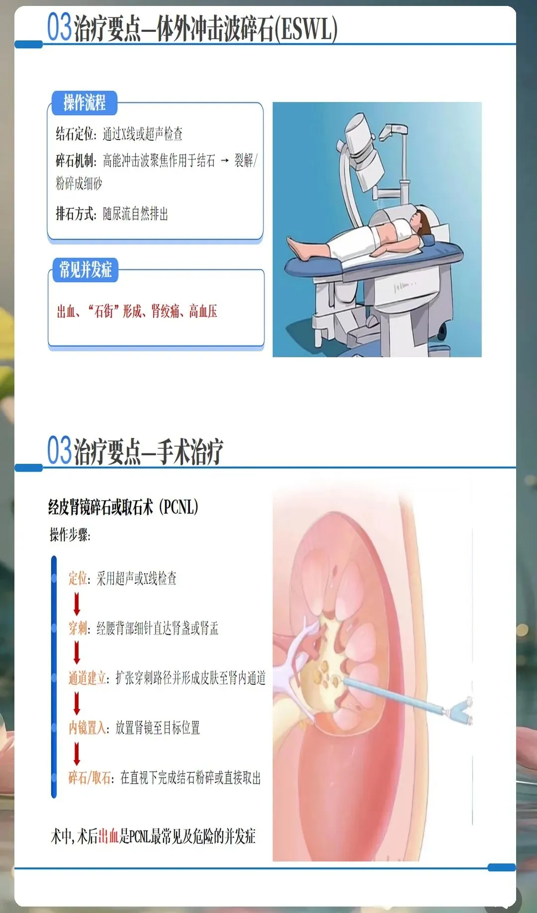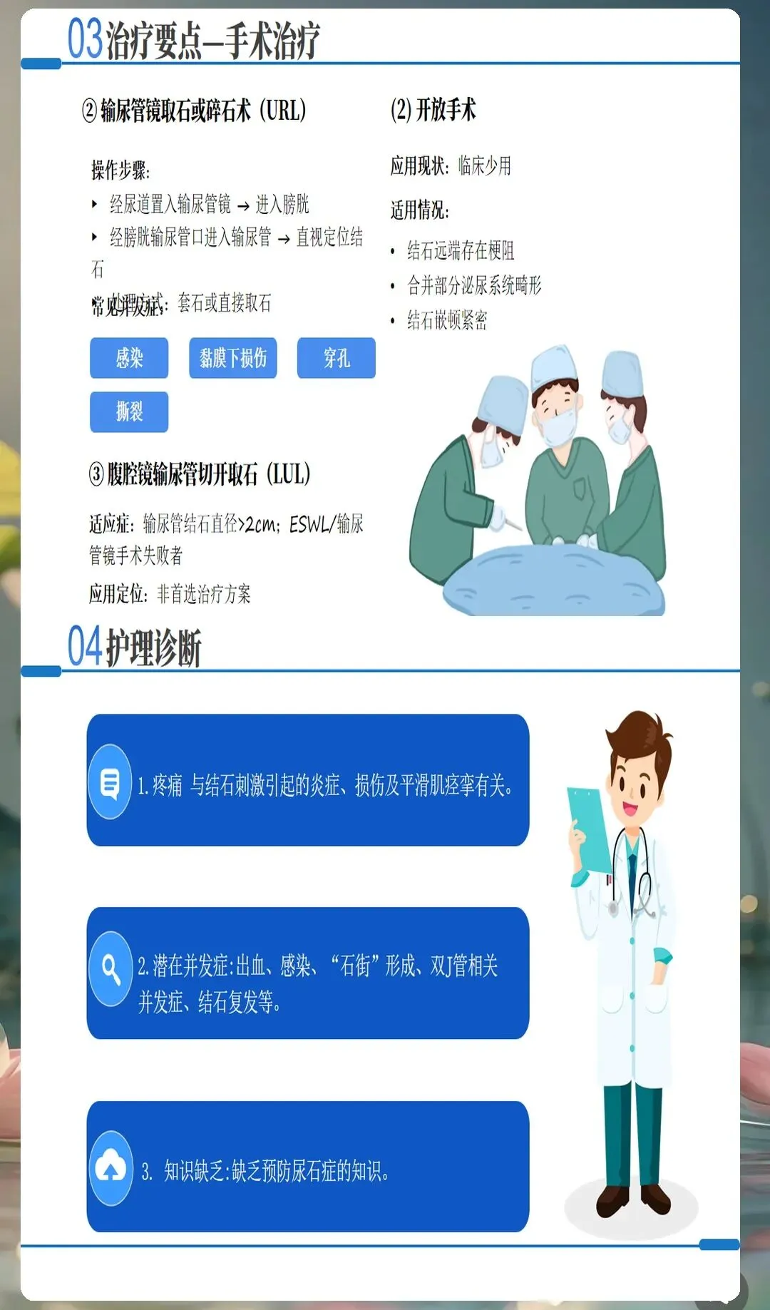 对于较大的结石或保守治疗无效的患者,常需手术治疗,包括体外冲击波碎石、输尿管镜碎石取石术、经皮肾镜碎石取石术等。围手术期护理的重点在于预防并发症和促进康复。