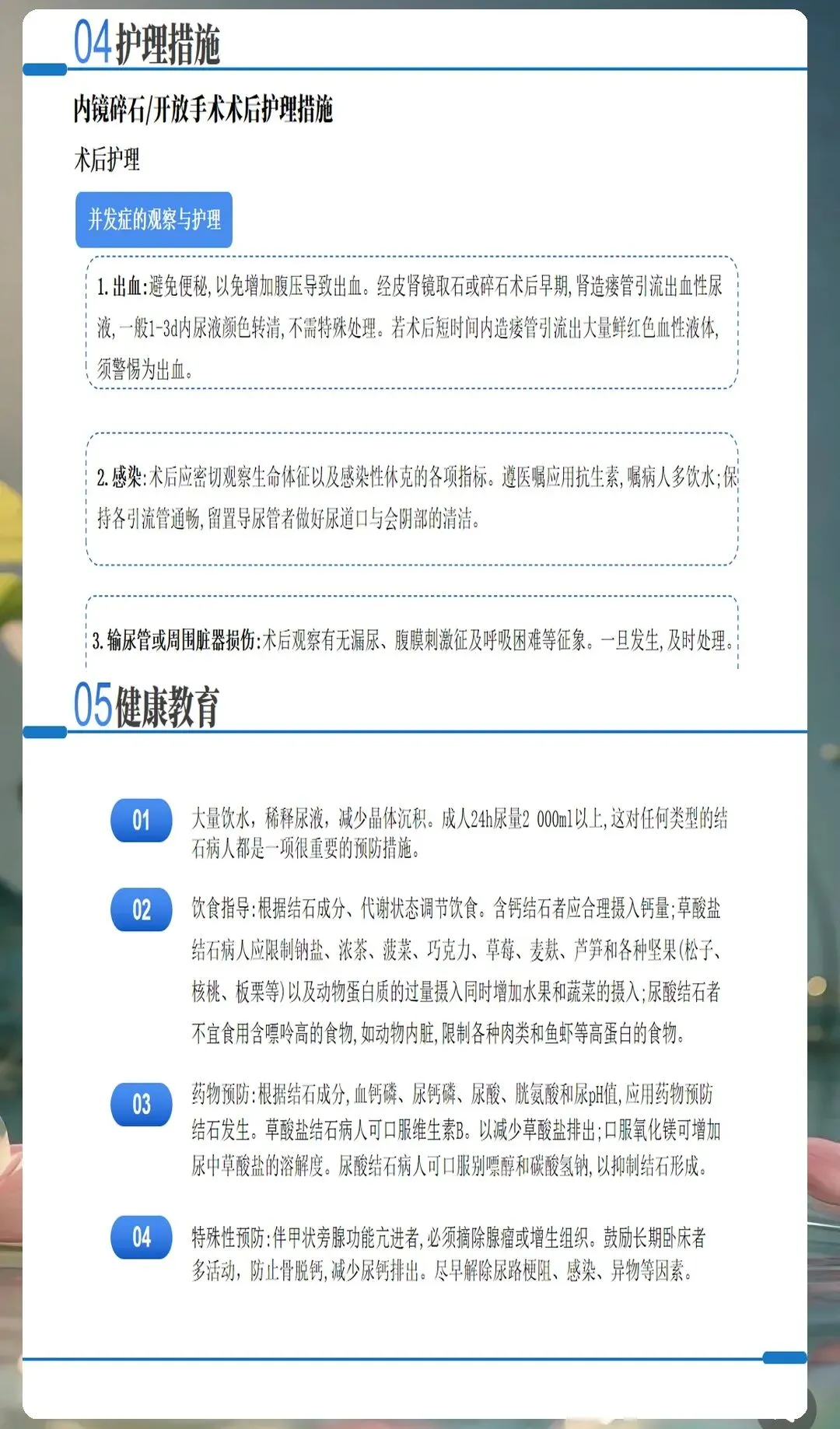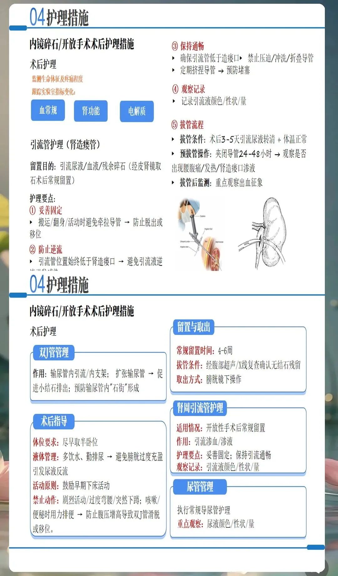 术后护理应密切监测生命体征,观察出血、感染、尿瘘等并发症征兆。对于经皮肾镜碎石取石术患者,应观察肾造瘘管引流情况,保持通畅,防止脱落。对于输尿管镜碎石取石术患者,应观察输尿管支架管的位置和功能,防止移位或堵塞。