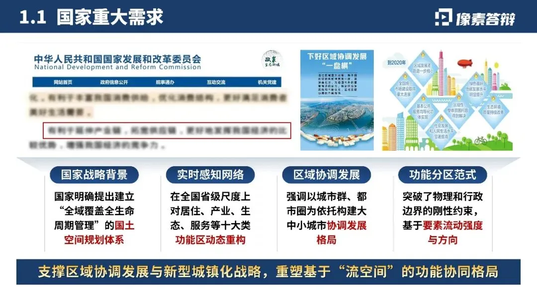 战略需求立基: 紧扣国家国土空间规划、区域协调发展重大战略,开篇即点明项目立项背景与时代价值,快速建立评委对项目“必要性”的高度认可,筑牢答辩立意根基。