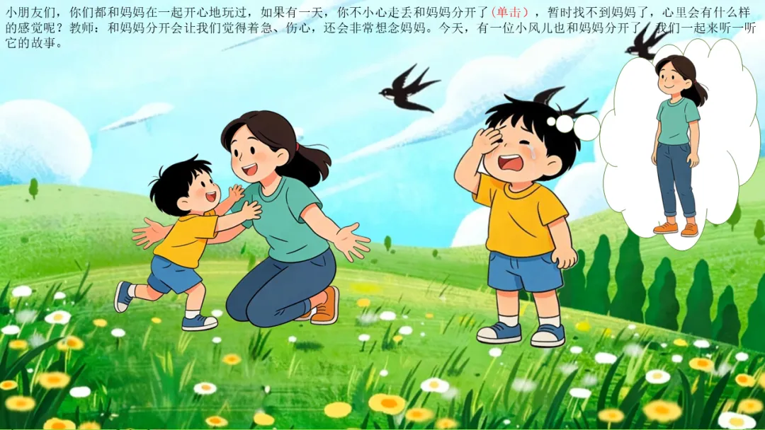 2. 幼儿自由表达,教师小结:和妈妈分开会让我们觉得着急、伤