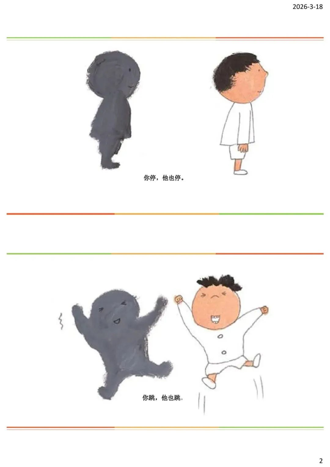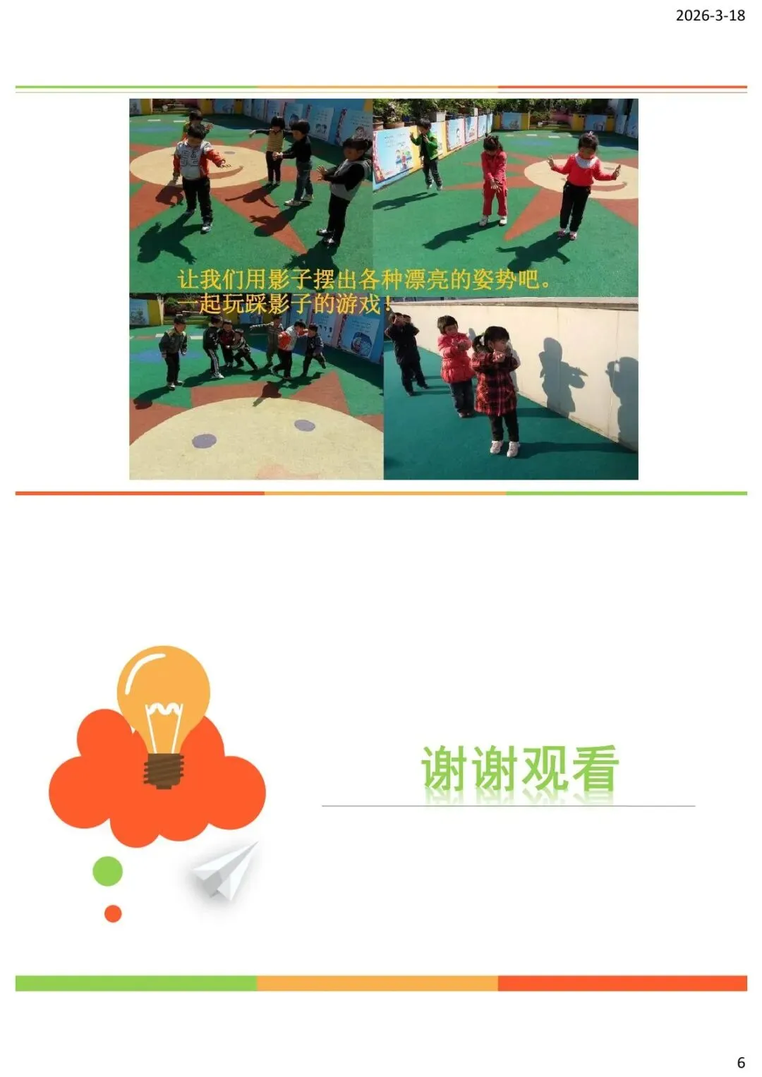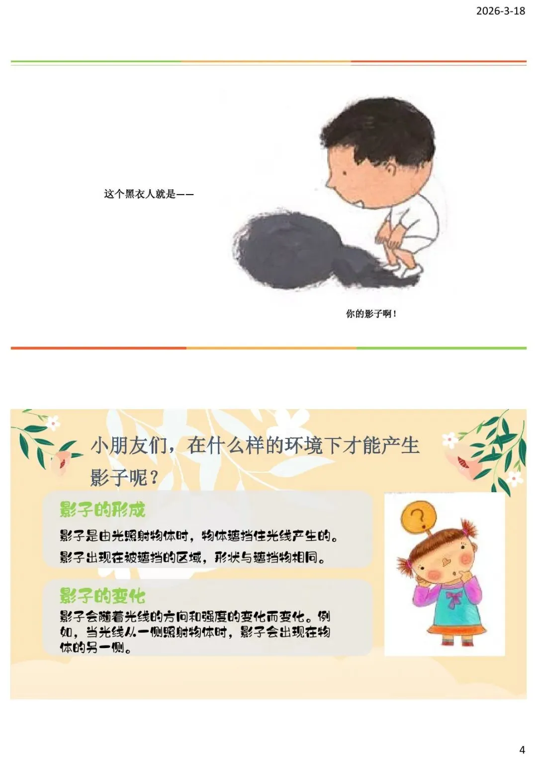 “希望你们以后在日常生活中,也能多观察、多发现影子的奥秘,和影子成为好朋友。比如,在晴天的时候,你们可以看看自己的影子在一天中的变化;在晚上的时候,你们可以用手电筒和物体玩影子游戏。”