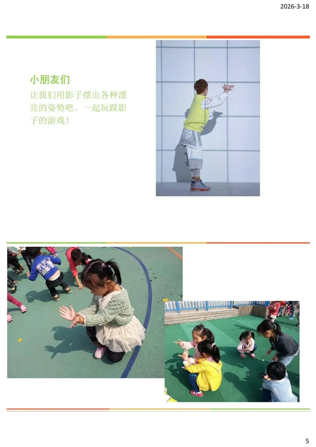 “好了,了解了影子的形成和变化后,我们再来玩一个有趣的游戏吧——踩影子!”