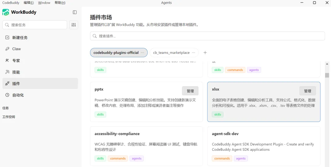 在WorkBuddy官方Skill库搜索"Excel",点击安装即可。支持.xlsx、.xls、.csv格式,兼容Windows和Mac系统。