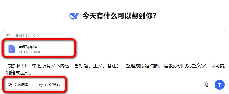 3. 在对话框中输入指令:“请提取 PPT 中的所有文本内容(含标题、正文、备注),整理成段落清晰、层级分明的完整文字,以可复制格式呈现”。