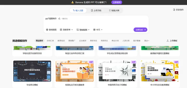 需要快速完成整份 PPT 制作的职场人、教师、学生;适配商务汇报、教学课件、活动宣讲、毕业答辩等场景,尤其适合追求一站式操作、不想切换多个工具的效率型用户。
