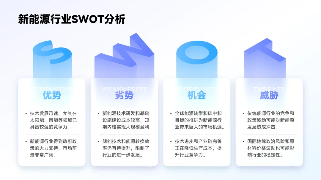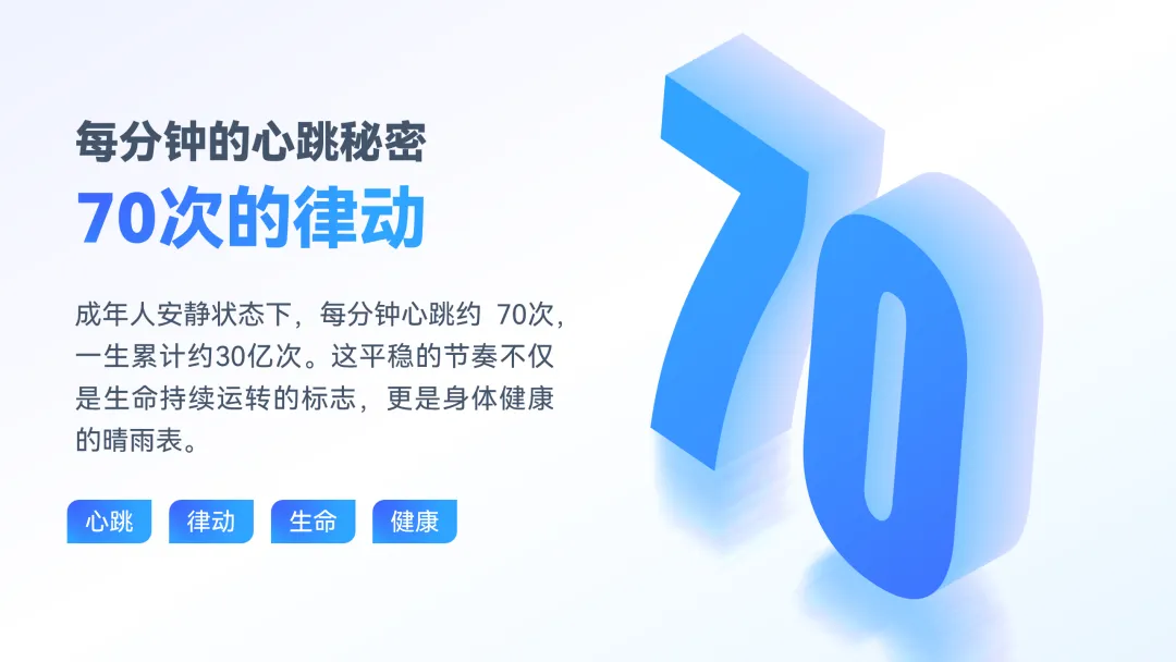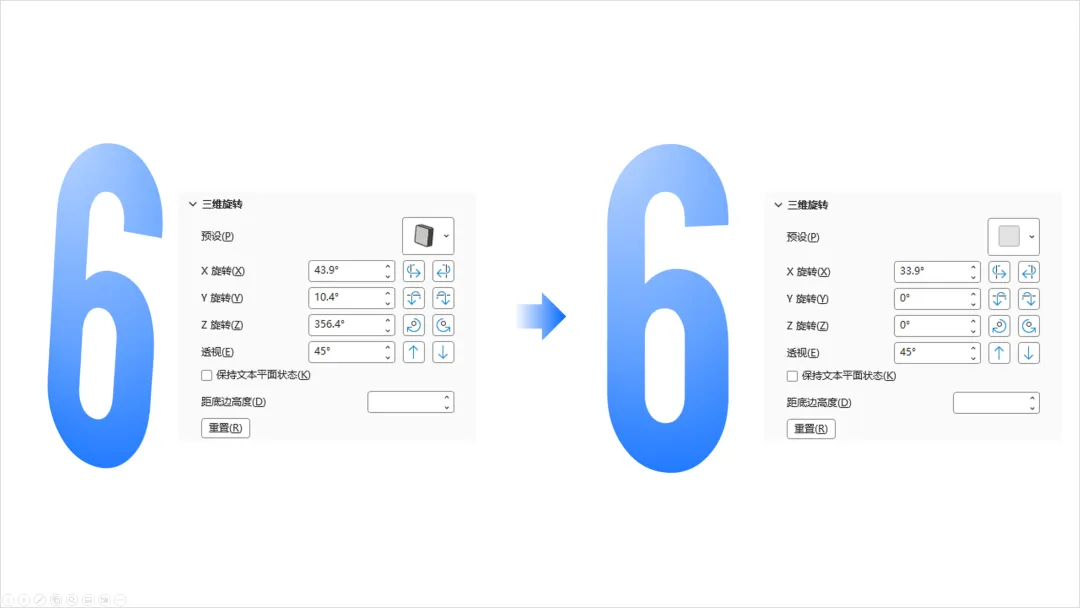 选中文本,右键【设置形状格式】,点击【文本选项】-【文字效果】-【三位旋转】。选择一个合适的透视效果,我这里选择的是【透视:左向对比】。注意如果想将数字掰正,需要将【Y(旋转)】和【Z(旋转)】参数设置为0°。在设置三维旋转这一步骤,大家可以多多尝试不同的预设效果。三维格式中有两个参数需要设置,一是【深度】,二是【光源】。【深度】参数的大小关系着立体字侧面的厚度,数值越大,立体字越厚。在以上的一系列步骤都设置好后,我们得到的字体效果其实是这样的。就是【光源】,默认【光源】的选项是【三点】,我们需要将其手动调整为【对比】。颜色即可恢复为最初设置的【文本填充】和【文本轮廓】的颜色。以上,就是用三维旋转制作立体字的全部啦!还是很简单的,记得动手跟练哦~当你熟练掌握了这套操作流程,随意切换不同的三位旋转预设效果,就可以得到不同姿势的立体字啦~借助Islide插件的【补间】功能,也可以做出效果不错的立体字效果。其原理就是利用无数个文字的堆叠最终形成立体字的厚度。相比较三维旋转而言,【补间】工具制作的立体字渐变会更加自然。首先,我们需要将文字复制一份,摆放好位置,距离越远则最终呈现的立体字厚度越厚,填充为深浅不一的颜色。全选文字,点击Islide插件的【补间】功能,设置【补间数量】,点击【应用】即可,我这里的数值是100。由于补间数量较多,建议全选对象编组后转成图片格式,避免PPT卡顿。掌握了这个方法,就可以得到这样漂亮新颖的页面效果。