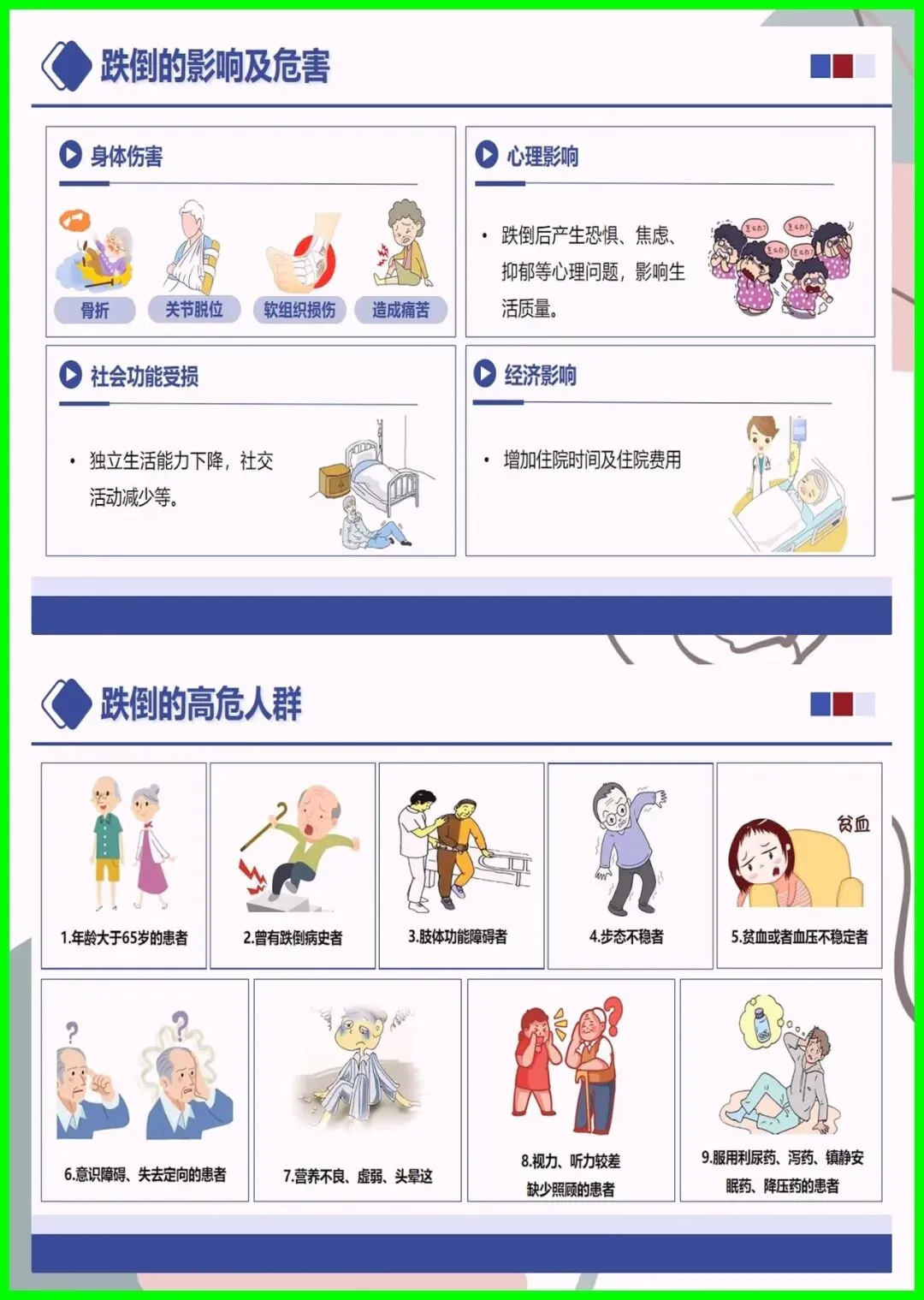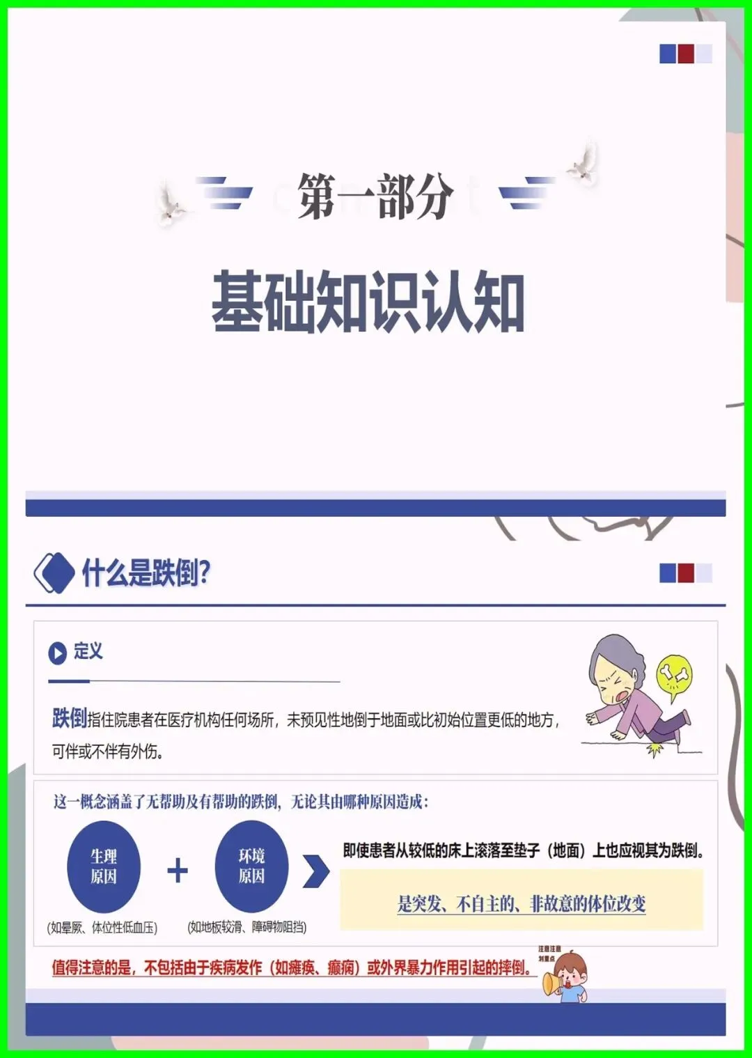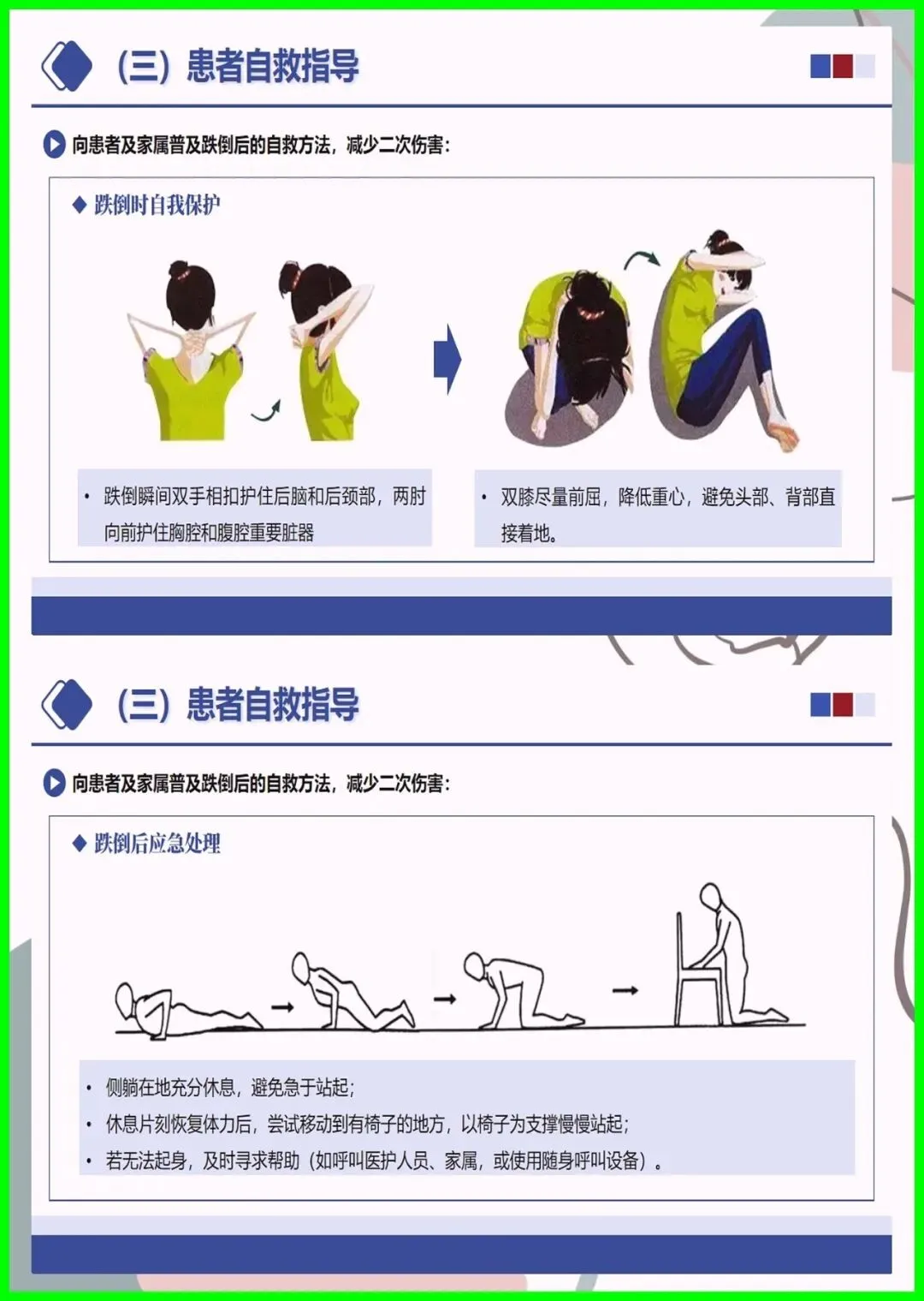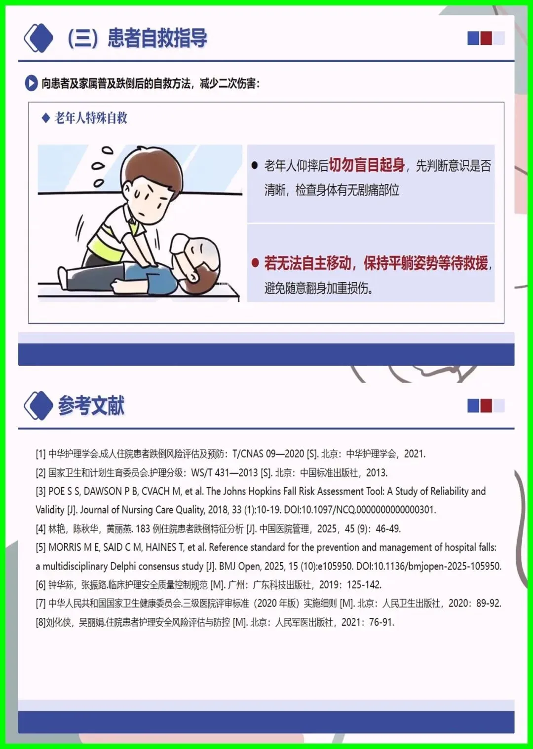 大家好,住院跌倒可不是小事,不仅会造成擦伤、骨折,严重时还会危及生命,更是医院常见的不良事件。尤其是 65 岁以上老人、术后患者、服用降压镇静药的人群,跌倒风险更高,环境湿滑、照明不足也会埋下隐患。其实跌倒可防可控,入院后会做风险评估,低中高风险各有专属防护,比如贴警示标识、专人陪护、优化病房环境。万一不慎跌倒,别着急起身,先护住头部,及时呼救,医护会第一时间处理。做好防跌倒,医患共努力,才能让就医更安心。
