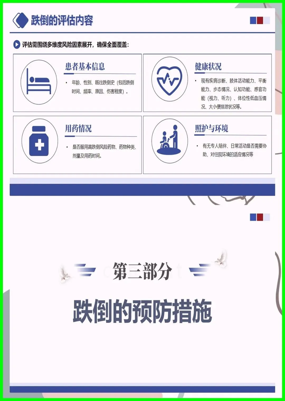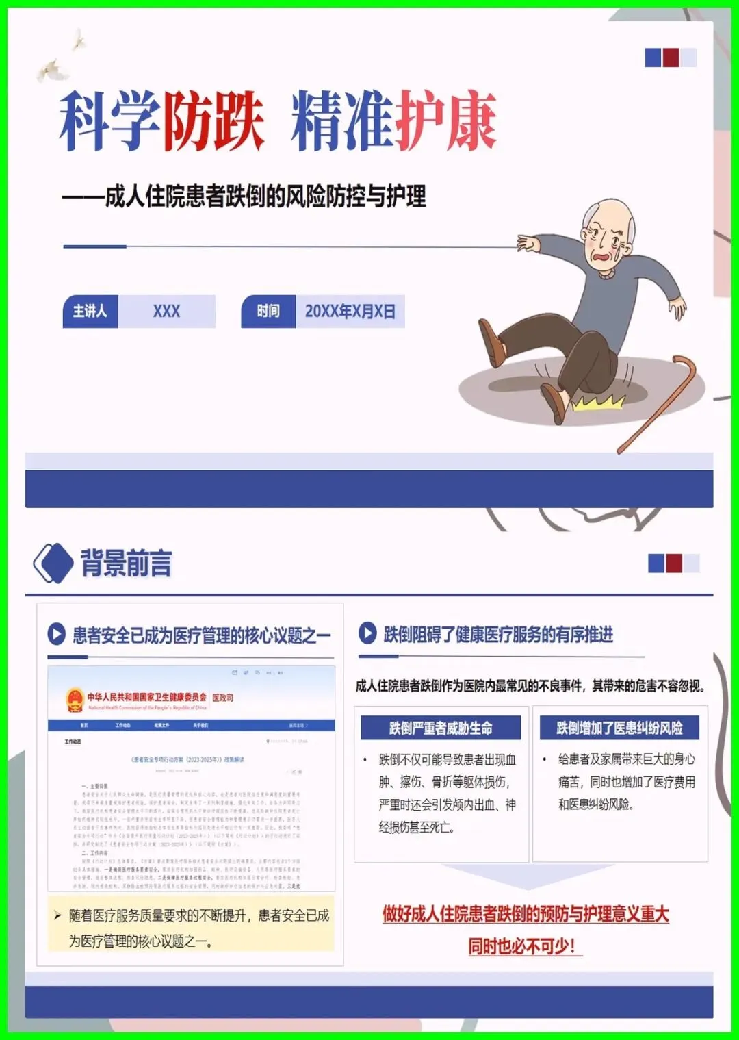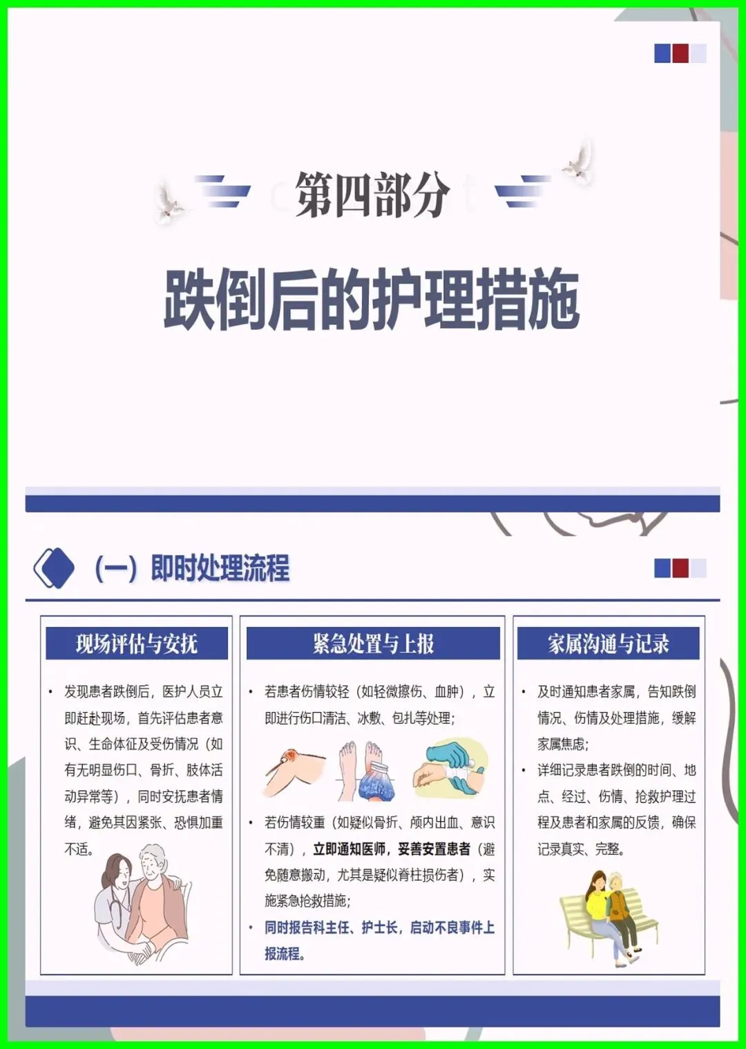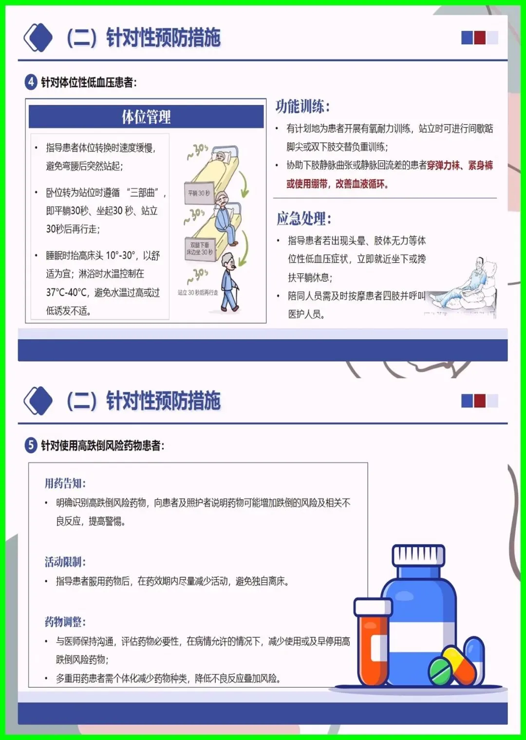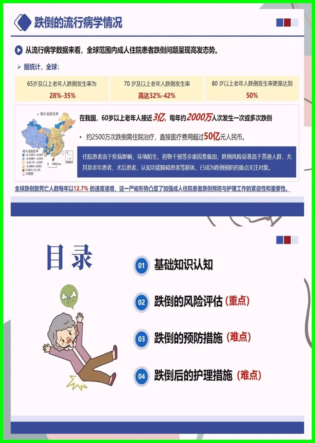 大家好,住院跌倒可不是小事,不仅会造成擦伤、骨折,严重时还会危及生命,更是医院常见的不良事件。尤其是 65 岁以上老人、术后患者、服用降压镇静药的人群,跌倒风险更高,环境湿滑、照明不足也会埋下隐患。其实跌倒可防可控,入院后会做风险评估,低中高风险各有专属防护,比如贴警示标识、专人陪护、优化病房环境。万一不慎跌倒,别着急起身,先护住头部,及时呼救,医护会第一时间处理。做好防跌倒,医患共努力,才能让就医更安心。