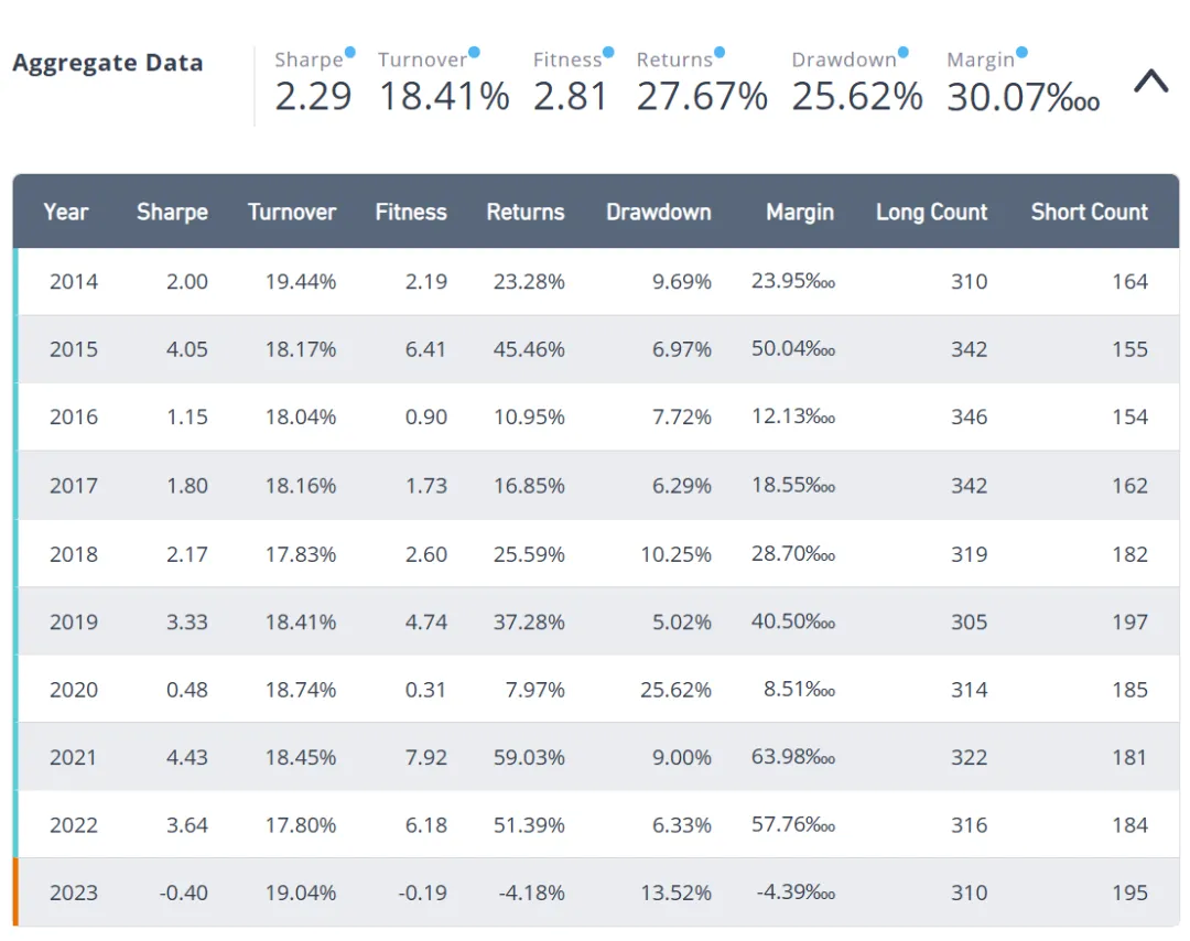 直到,笔者在世坤(worldquant)发现了一个看起来不错的方法。根据因子值的大小构建一个多空组合,因子值大于0的做多,小于0的做空,然后展示一下这个因子几年的夏普之类的信息。就像下面这张图一样。
