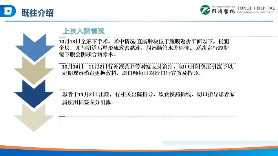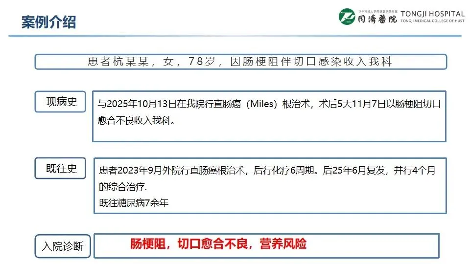 经14天护理,患者感染指标下降,血糖控制稳定,造口黏膜分离逐渐愈合。本病例提示:高龄Miles术后患者需早期识别危险因素,实施多学科整合护理和精准营养支持,造口黏膜分离的规范处理是促进愈合的关键。该课件为临床同类疑难病例的护理提供可复制的实践参考。