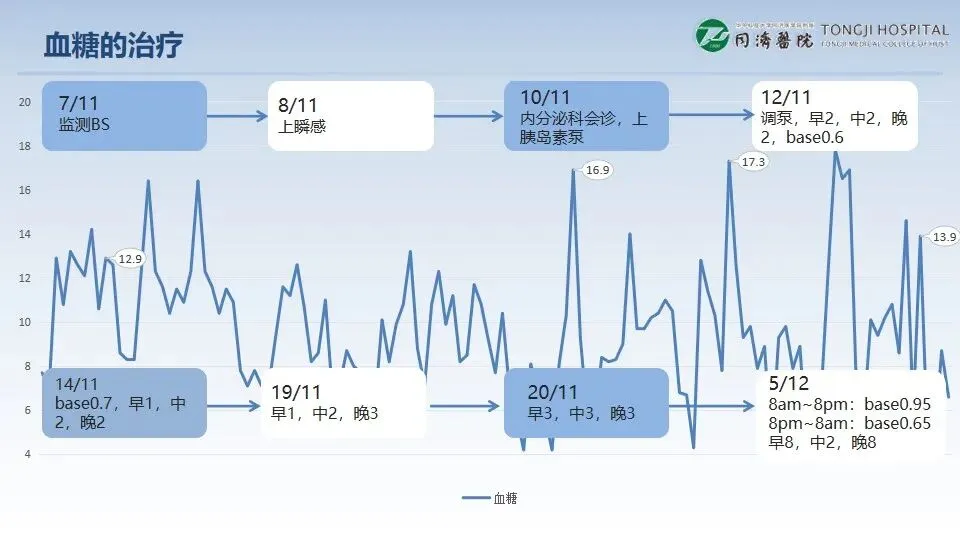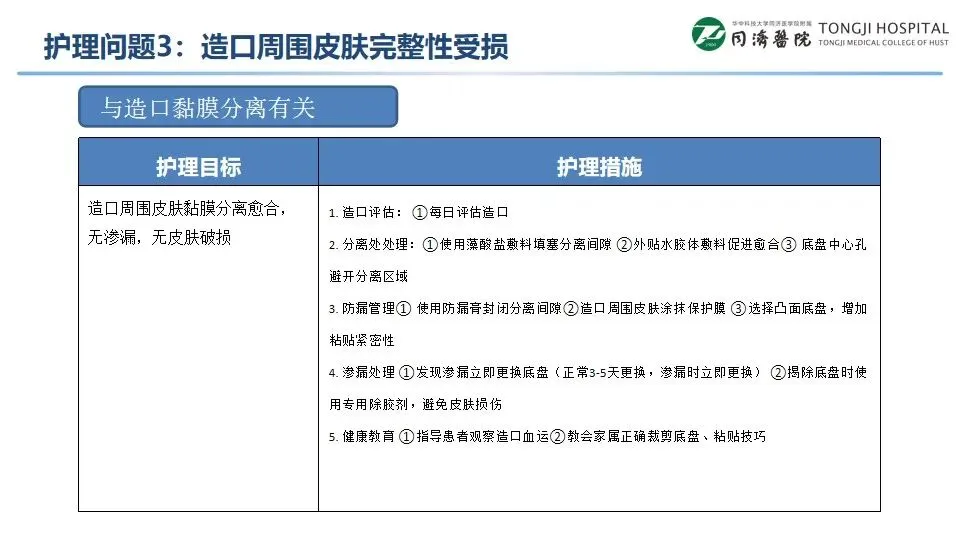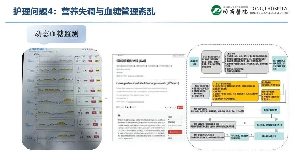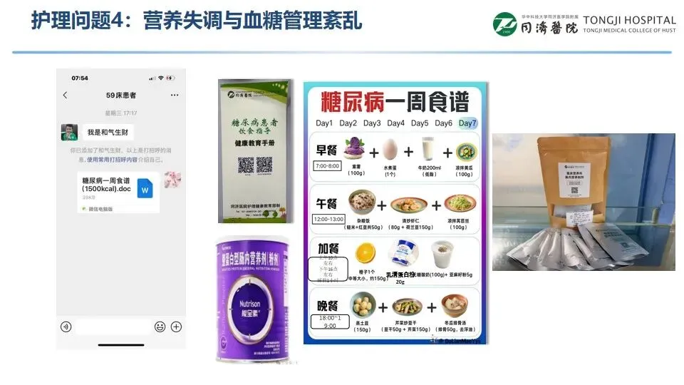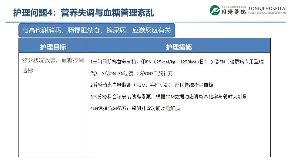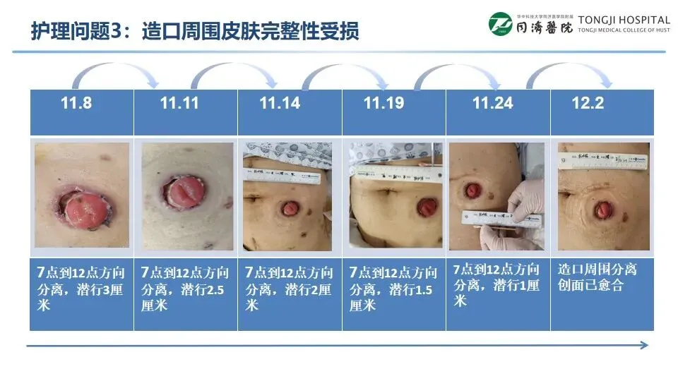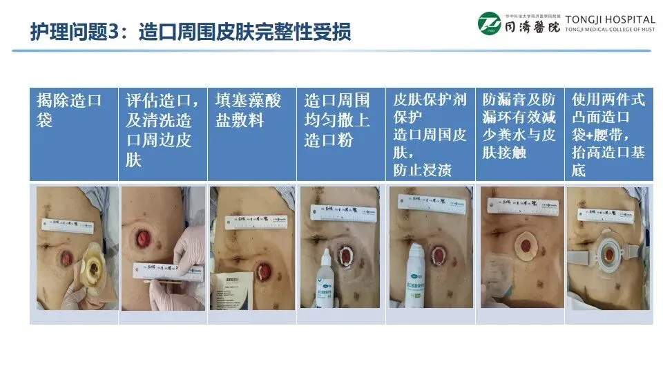 针对该患者,我们采取多学科协作的精准护理措施:内分泌科会诊行胰岛素泵动态控糖,创外科协助开放切口负压引流,营养科制定四阶段营养支持方案(肠外营养→肠内营养→口服营养补充)。造口专科护理采用"评估-填塞-防漏-更换-教育"五步法,使用藻酸盐敷料填塞分离间隙,凸面底盘增加粘贴紧密性。