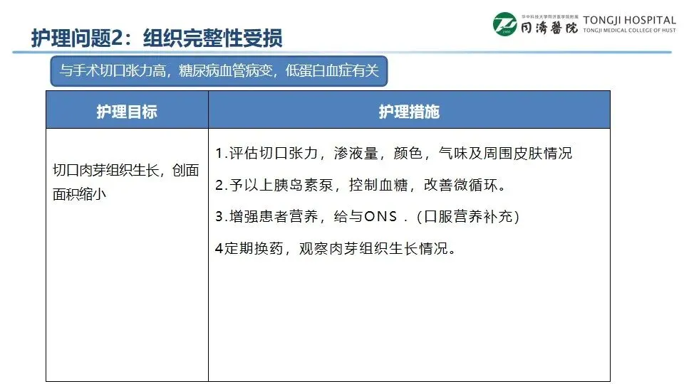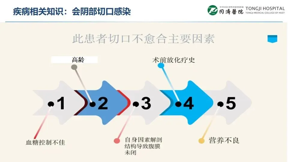 本病例为78岁女性,Miles术后并发肠梗阻、切口感染及造口黏膜分离。愈合不良危险因素包括:高龄、20年糖尿病史致血管病变和免疫功能低下、营养不良(白蛋白<30g/L)、手术创伤大。这些因素相互叠加,导致切口张力高、渗液多、肉芽组织生长缓慢。