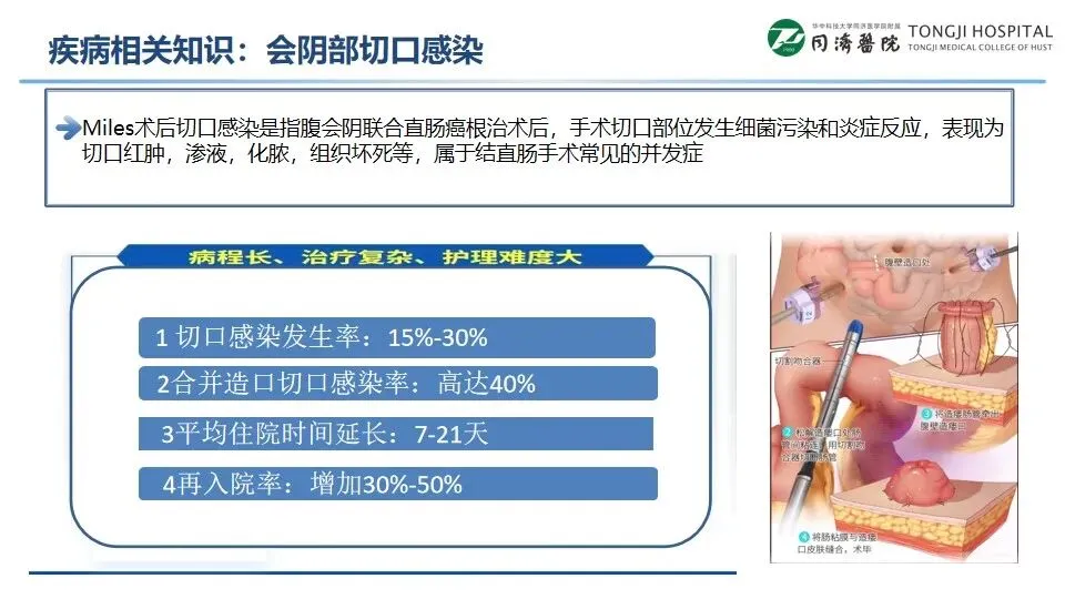 Miles手术(腹会阴联合直肠癌根治术)是低位直肠癌的标准术式,需切除直肠、肛管及周围组织,并行永久性结肠造口。该手术创伤大、时间长,术后切口感染发生率达15%-30%,合并造口黏膜分离时处理难度显著增加。