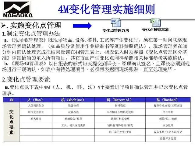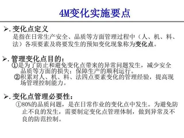 4M变化点指生产过程中,人、机、料、法四大要素发生的偏离标准状态(如作业标准、设备参数、物料规格等)的所有变化,分为以下两类,均需进行社内确认: