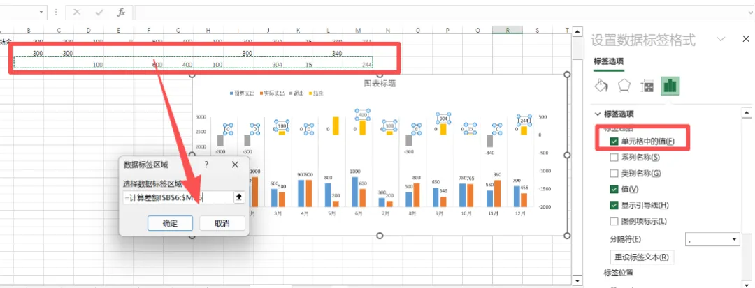 每一根柱子上方都标注了具体数值,超出/结余部分还用醒目的红色/绿色字体+箭头标注差额,让数据“会说话”。