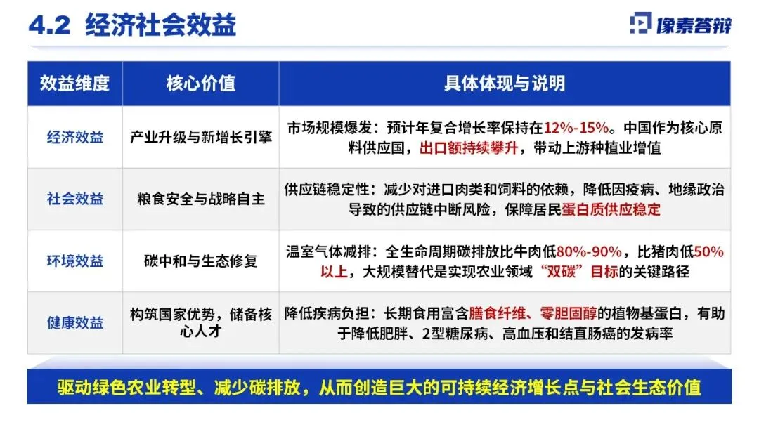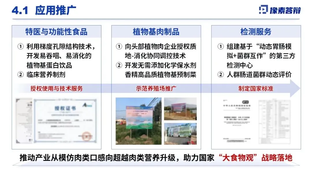技术已落地特医食品、植物基肉制品、饲料等多领域,开发易消化蛋白饮品、高品质预制菜等产品,还组建第三方检测中心、推动国家标准制定。项目带动产业从原料出口向技术标准出口升级,经济上推动产业年复合增长12%-15%,社会上保障蛋白供应链自主稳定,环境上实现碳排放大幅降低,健康上助力减少慢性疾病发病,同时推动绿色农业转型,落实大食物观与双碳战略。