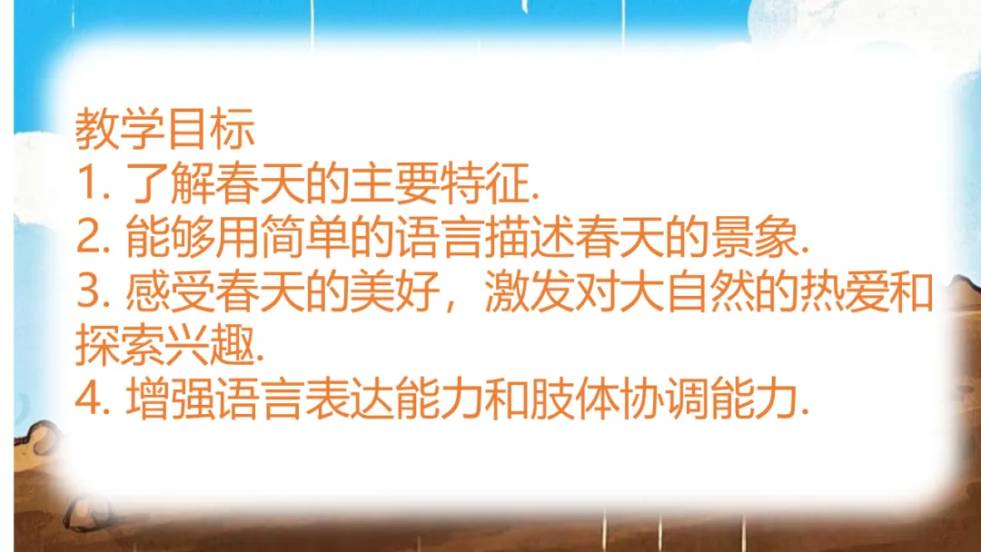 1. 认知目标:了解春天的主要特征,如雷声、河水流动、种子发芽、燕子飞回、