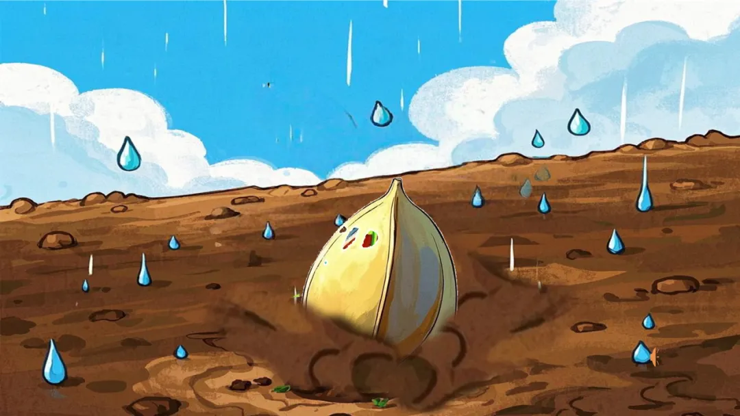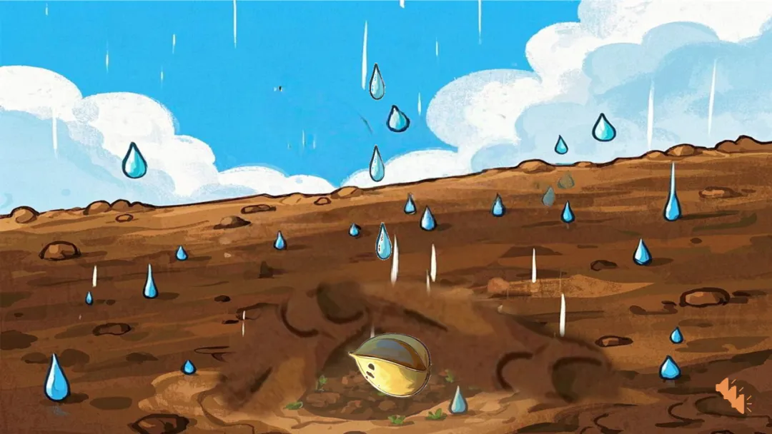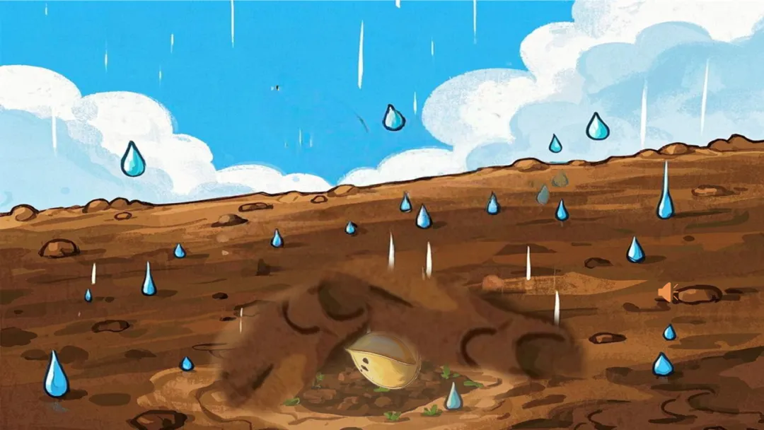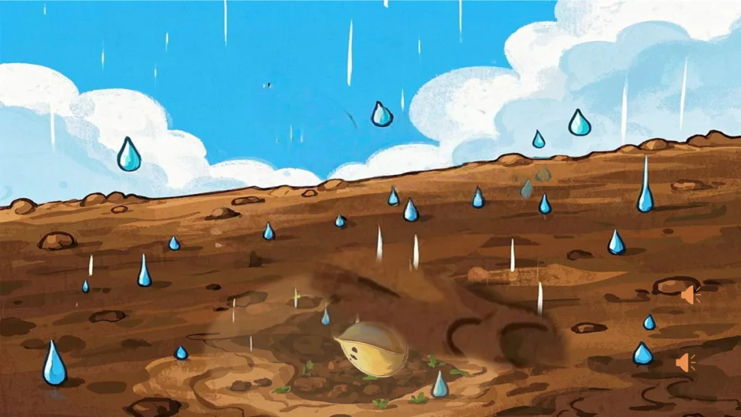 - 小种子喝了三口甜甜的雨水,小种子说真好喝,小种子脱掉外皮,慢慢要发