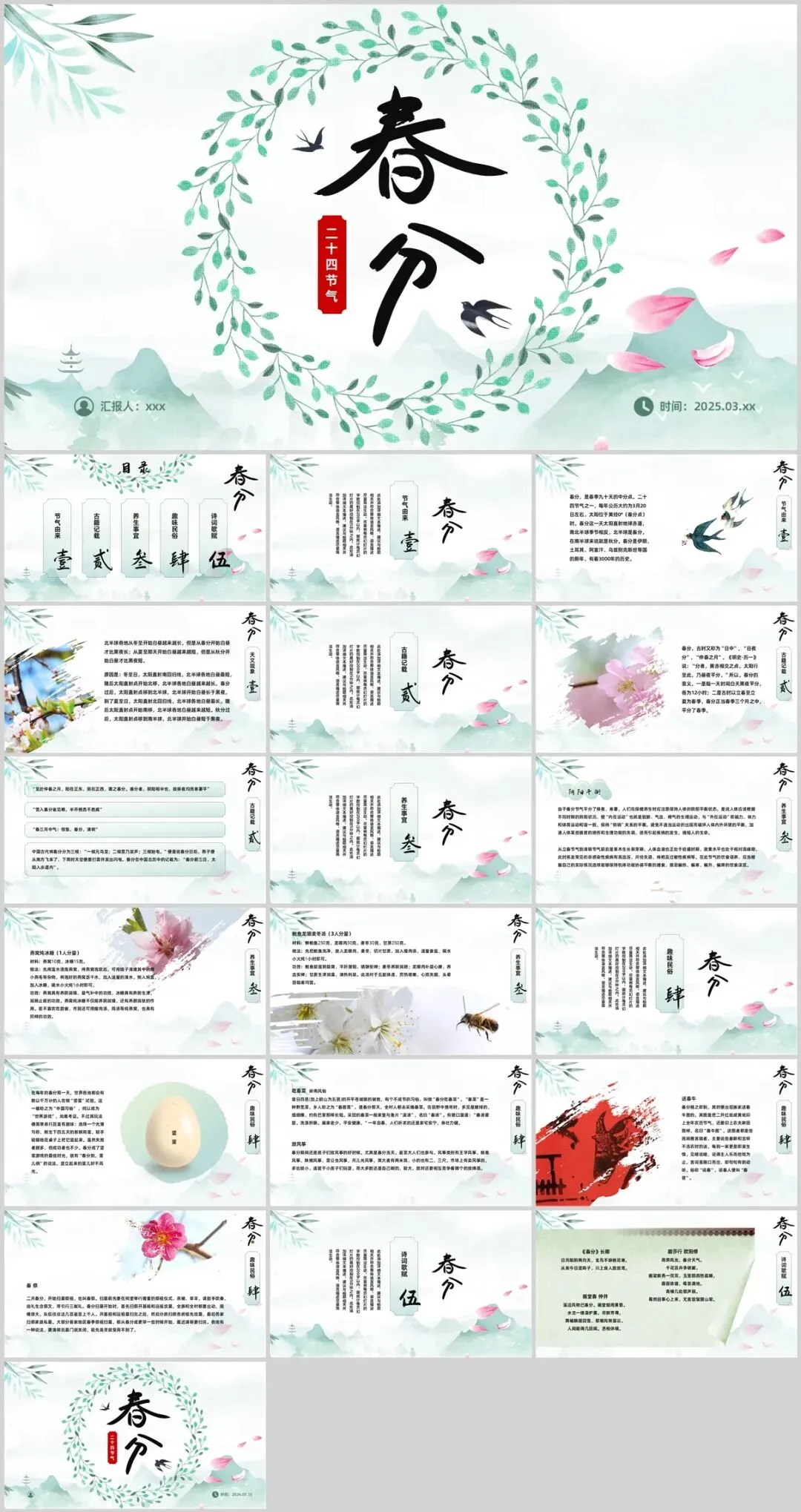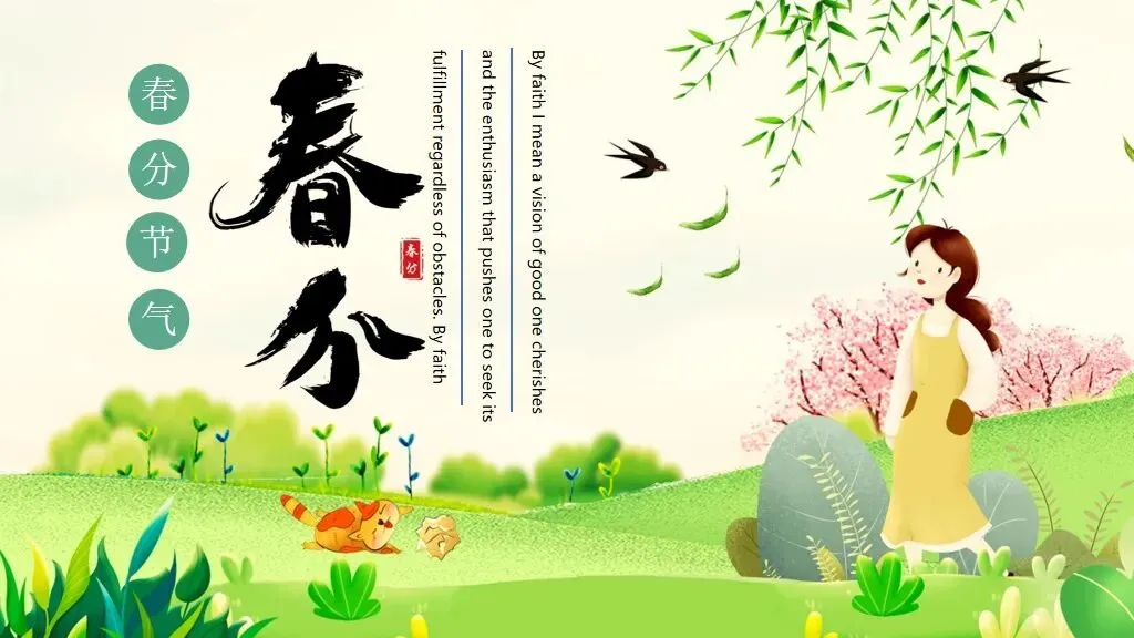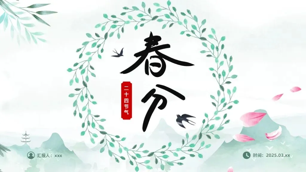 元素是灌注生机的气韵。我们摈弃繁杂的装饰,只提炼最核心的符号。可取自传统纹样的,并非完整的祥云龙凤,而是回纹、云纹的一小段,几何化后成为优雅的分隔线。节气的视觉核心——“三候”,用三个极简的线性图标来传达:一道弧线代表归来的玄鸟,一个“之”字形代表始发的雷声,一道折线象征破空的闪电。春分的经典习俗“立蛋”,也不必展示真实照片,一枚轮廓干净、略具抽象感的椭圆图形,稳稳立于一条水平线上,其意自明。文字的呈现,是古今对话的关键。标题可选用一款有书法韵味的字体,但需笔画清晰,利于远观;正文务必使用端庄易读的无衬线字体,保障信息的有效传递。当引用“千花百卉争明媚”这样的诗句时,可让其以竖排、小字的形式,谦逊地居于留白处,宛如画上的题跋,等待有心的读者去发现。毕竟,最好的设计,是让人看见内容,然后忘记设计本身,唯留一片春和景明。9套春分主题PPT模板,免费下载方法如下: