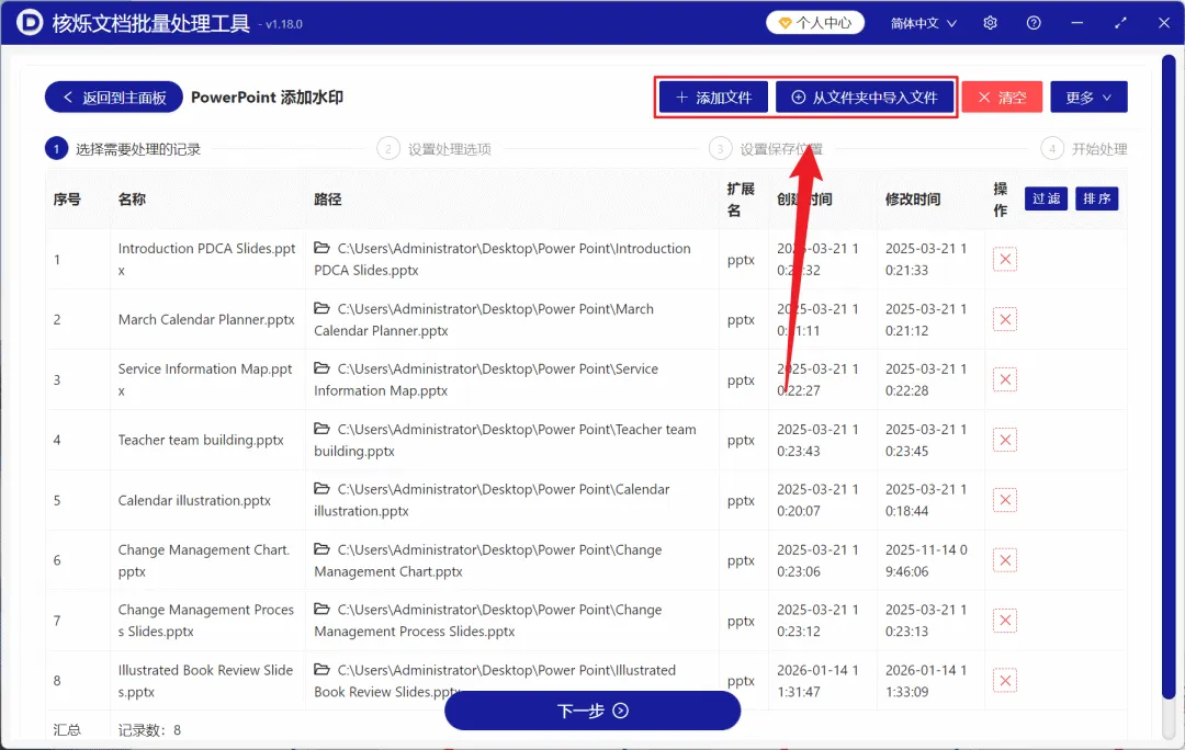 2、在【添加文件】或【从文件夹中导入文件】中选择一个方式将需要添加水印的 PPT 导入,也支持将文件直接拖入下方添加,然后点击下一步。