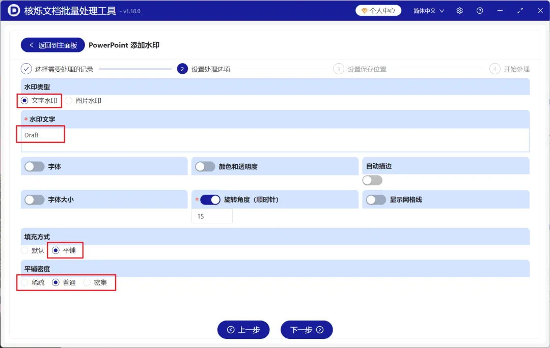 3、进入设置页面之后,水印类型选择【文字水印】,在下方输入要作为水印的文本,后面还可以调整水印字体、大小、颜色透明度以及旋转角度。填充方式选择【平铺】,密度可以选择稀疏、普通、密集,分别代表 2x2、3x3、6x6,设置完成后,再次点击下一步。接着点击浏览,选择好新文件的保存位置。