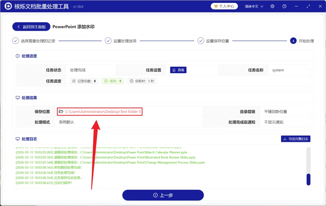 4、等待处理结束之后,点击框中红色的路径打开保存文件夹就能够查看水印添加完成的 PPT 文件。