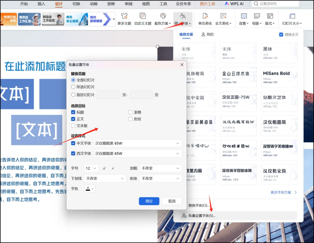 统一字体:【设计】→【统一字体】→【批量设计】,一键改所有标题/正文字体。