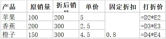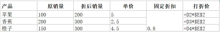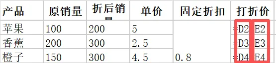 】存在于E2:E4合并后的单元格。E2:E4左上角是E2,那么E3和E4就都是空值,默认值为0。所以香蕉和橙子打折价用E3/E4计算出来为0。