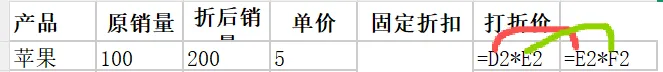那么上面的折扣价如果将E2绝对引用,自动填充的公式及结果将如下图所示:
