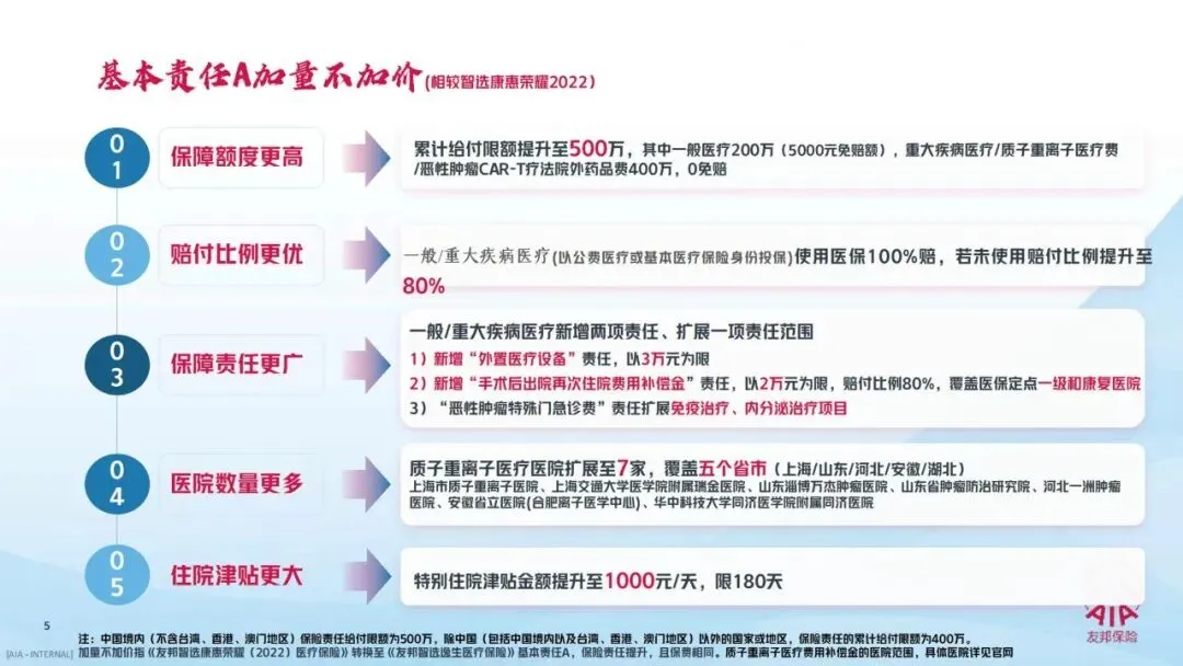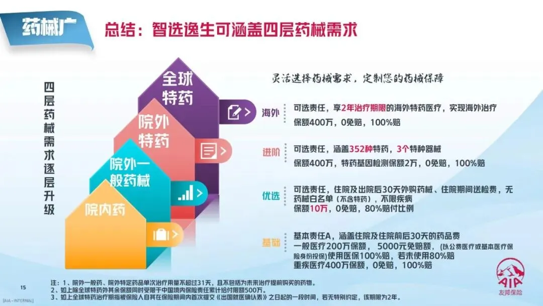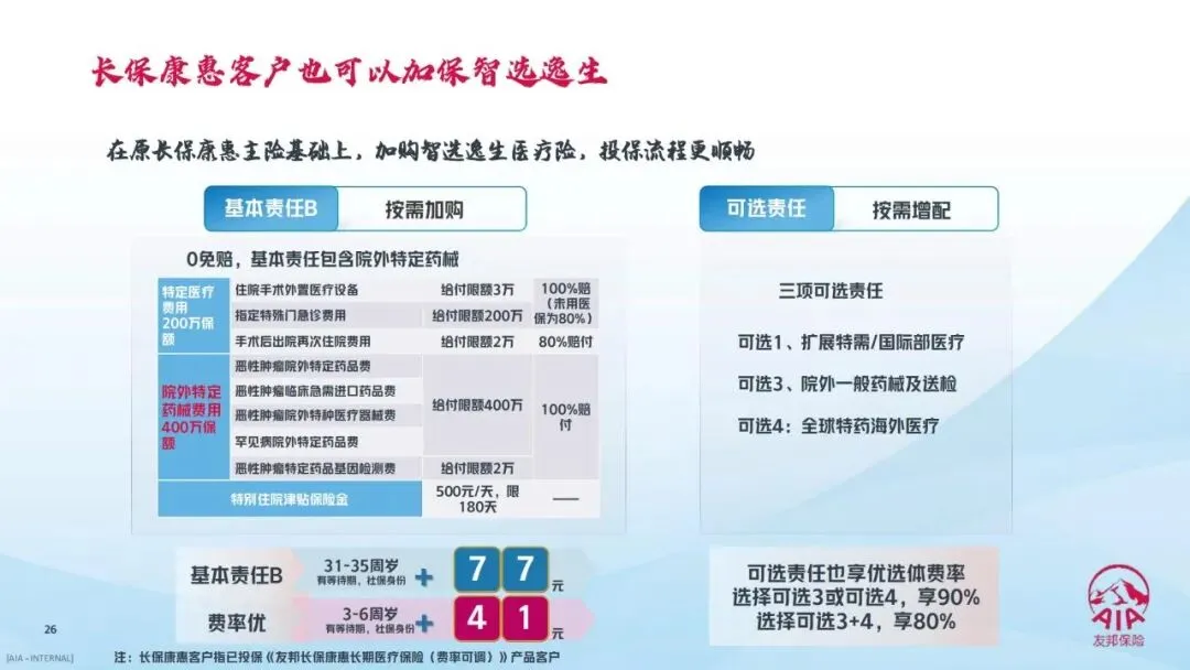 其中,基础核心为住院医疗保障(基本责任A),是所有保障的基石,相较友邦此前的智选康惠荣耀2022版本实现“加量不加价”,保障力度全面提升;药械类增配包含院外一般药械及送检、院外特定药械、全球特药海外医疗三项可选责任,层层升级满足不同用药需求;就医类增配为扩展特需/国际部医疗责任,打造高端就医体验,且支持“一城一策”五档计划,适配不同地区的医疗资源特点。