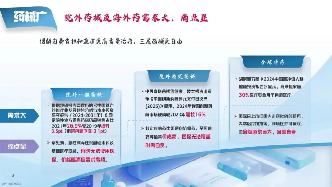 整体来看,产品可覆盖院内药、院外一般药械、院外特定药械、全球特药四层药械需求,从基础用药到海外高端用药,实现全场景覆盖。