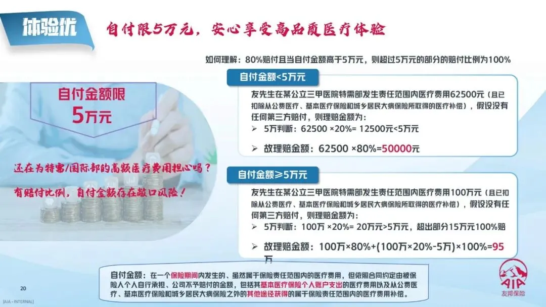 3.赔付规则更贴心:计划A-D及计划E的非核心区域,实行80%基础赔付,当自付金额超过5万元时,超过部分100%赔付,既降低日常高端就医的自付成本,又能应对大额高端医疗支出,最大程度减少消费者的经济压力。
