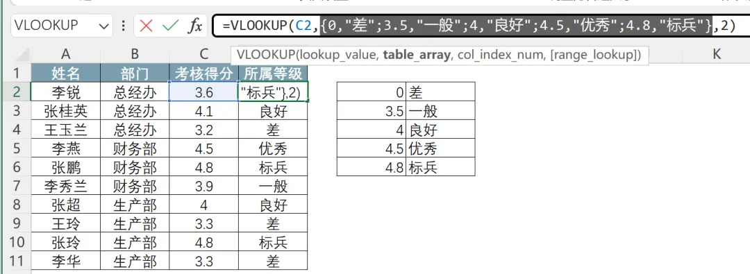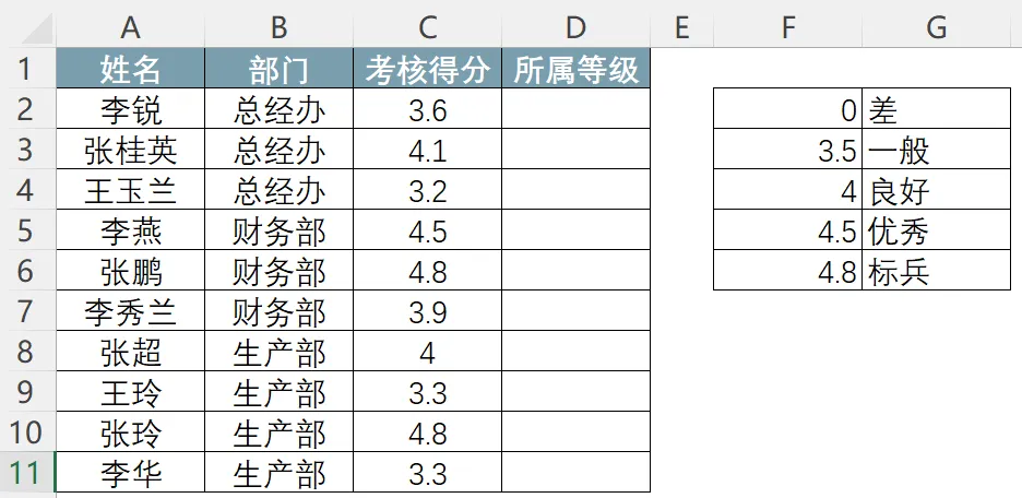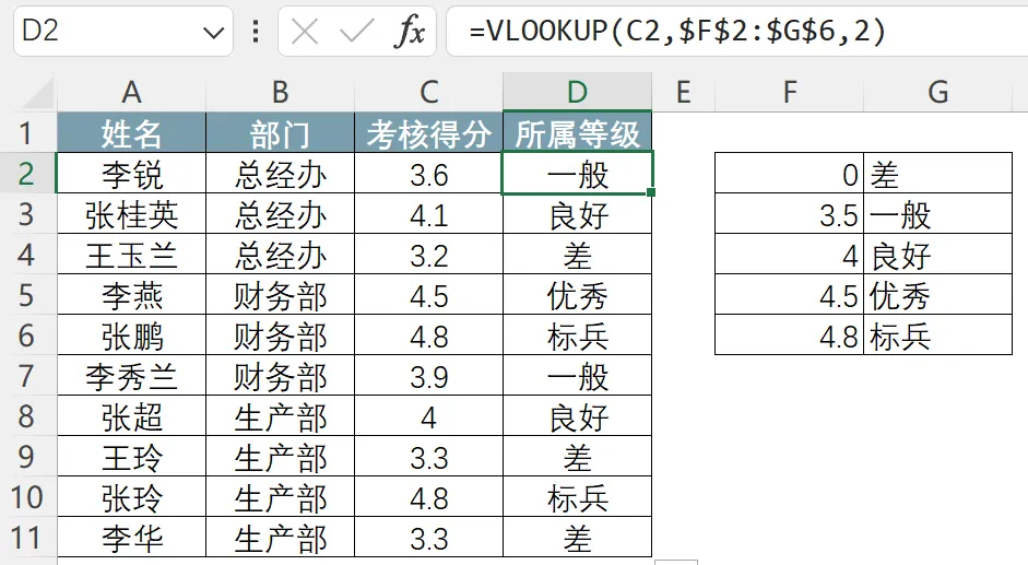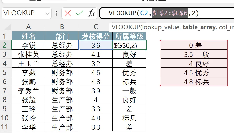 ② 查找区间的最左列的最小值要小于或等于查找值,如此案例中 F 列最小值要小于 C 列的考核得分;