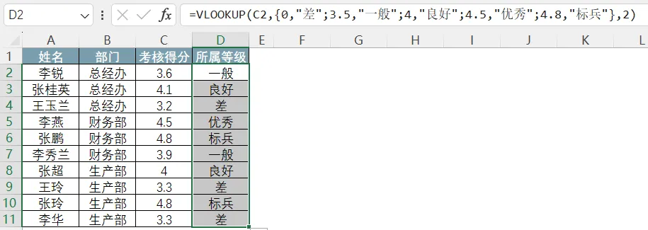 为了优化多层级判断公式的写法,首先根据考核规则制作一个辅助区域,如下图中所示的工作表 F2:G6 单元格区域。在 D2 单元格输入以下公式,将公式向下填充,效果如下图所示。VLOOKUP 函数是 Excel 中常用的查找与引用函数,用于根据用户指定的条件完成各种数据查询。它不但可以按条件精准查询,而且可以实现按区间条件归类的模糊查询,这里用到的就是按数值区间分层级归类的模糊查询。VLOOKUP 函数的这种模糊查询公式的语法结构如下: