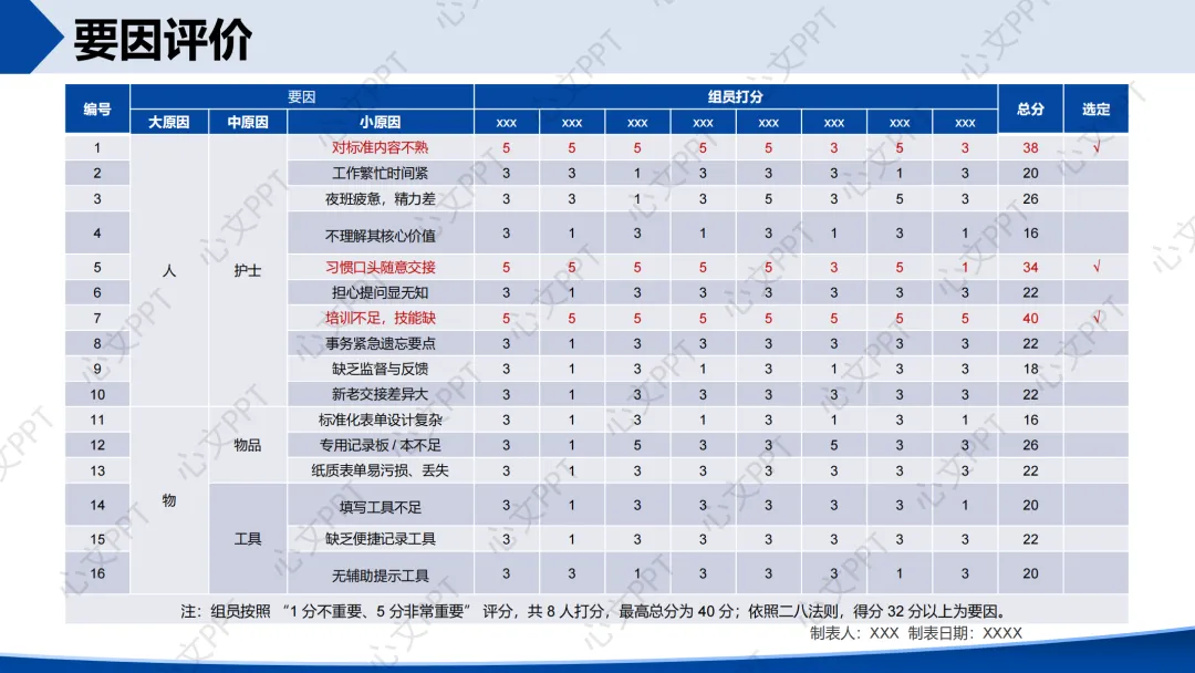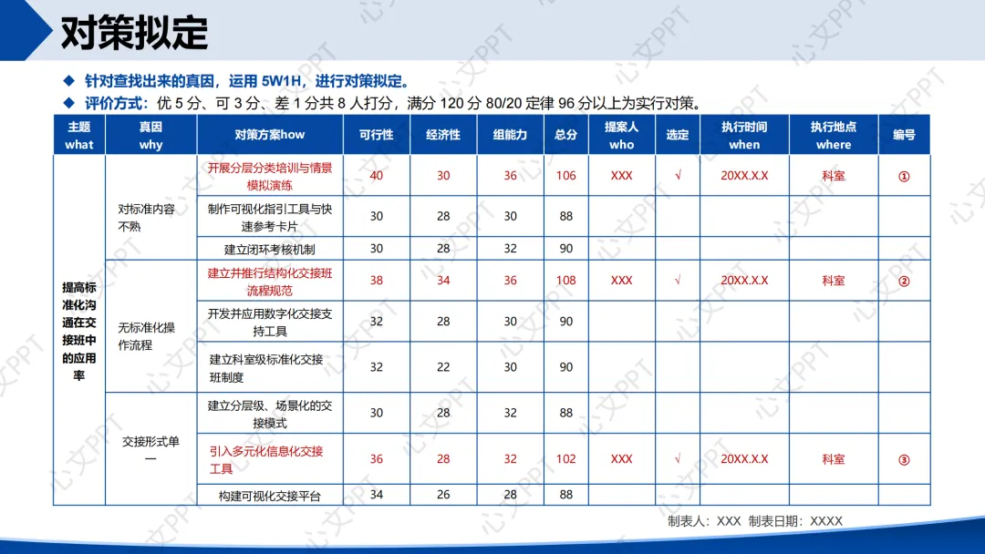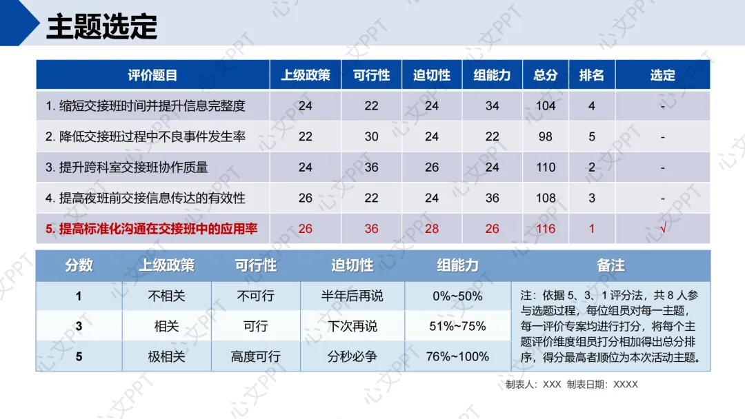 我们通过全员评分的方式,对五个候选主题进行评价,最终选定“提高标准化沟通在交接班中的应用率”为本期活动主题,得分116分,排名第一。