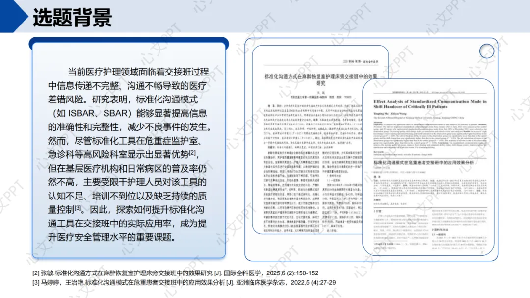 当前交接班过程中存在信息遗漏、表达不清等问题,易引发医疗安全隐患。研究显示,标准化沟通能显著提升交接质量,但在实际工作中应用率偏低,亟待改善。