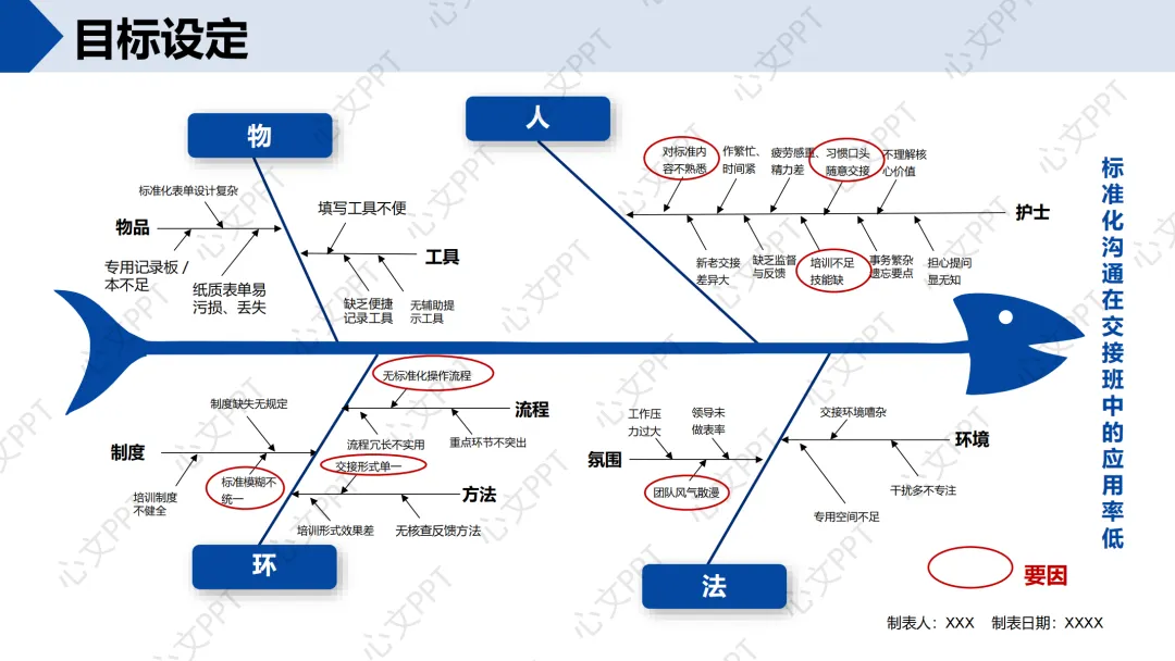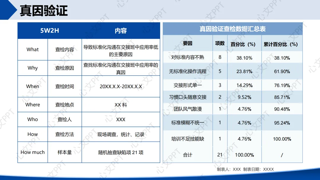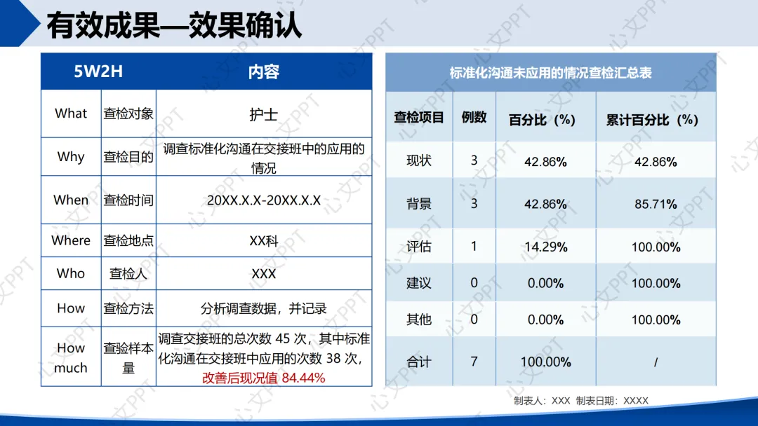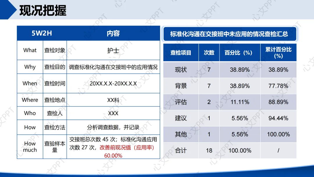 我们通过5W2H方法调查了45次交接班,标准化沟通应用次数为27次,应用率为60.00%。查检发现,“现状”和“背景”两项信息缺失占比高达77.78%,成为改善重点。