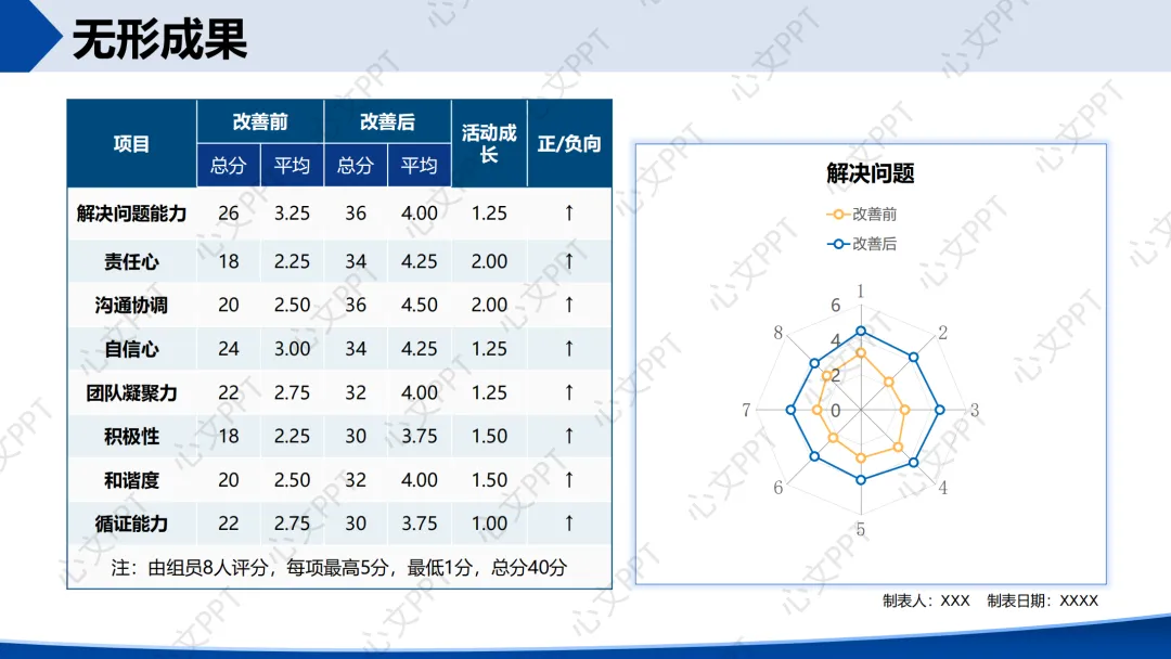 团队成员在责任心、沟通协调、团队凝聚力等方面均有显著提升,活动成长值正向增长。