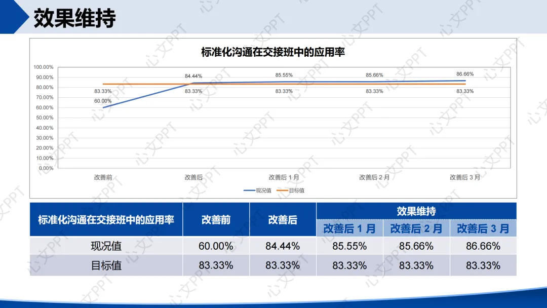 改善后共调查45次交接班,标准化沟通应用次数为38次,应用率达84.44%,超出目标值83.33%。
