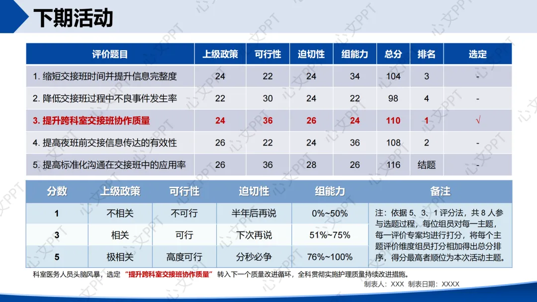 根据选题评分,我们初步选定下期活动主题为:“提升跨科室交接班协作质量”,继续深化交接班管理。