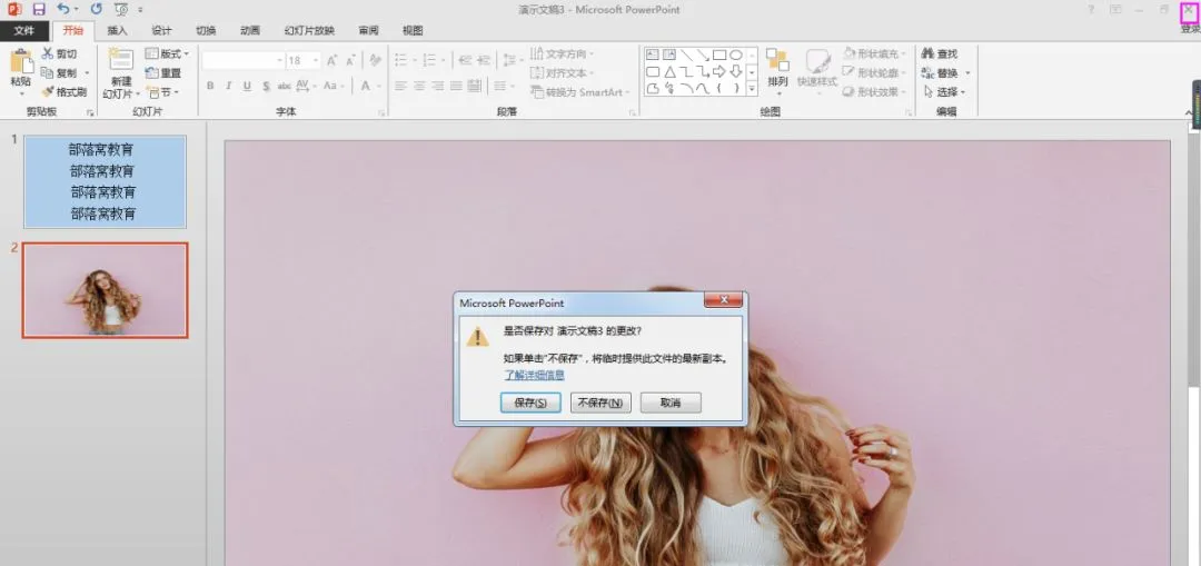 常规操作:点击窗口中的“×”后,弹出“MicrosoftPowerPoint”窗口后,进行选择“保存”“不保存”“取消”操作。