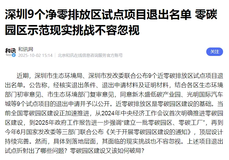 深圳市生态环境局一口气将9个近零碳排放区试点项目从名单中移除,其中包括新木盛低碳产业园、光明国际汽车城等