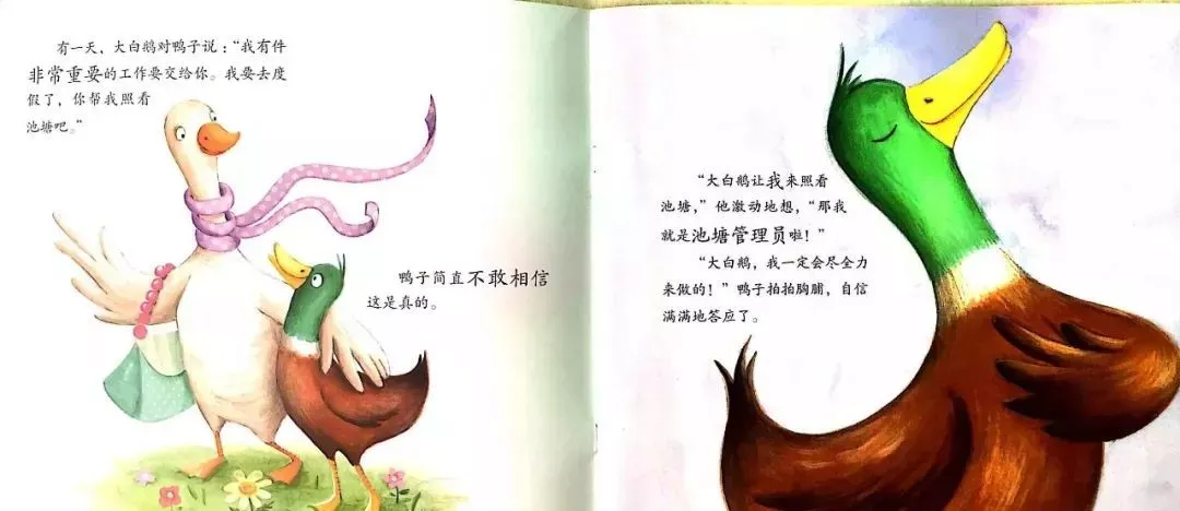 有一天,大白鹅对鸭子说:“我有件非常重要的工作要交给你。我要去度假了,你帮我照看池塘吧。”