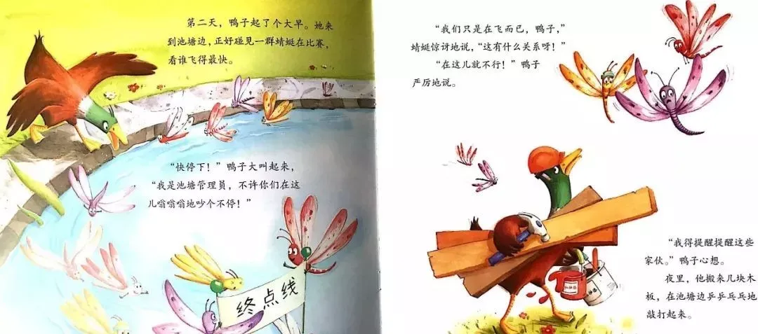 第二天,鸭子起了个大早。她来到池塘边,正好碰见一群蜻蜓在比赛,看谁飞得最快。