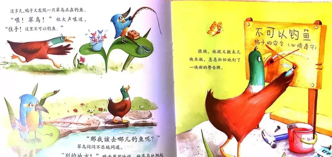 没多久,鸭子又发现一只翠鸟正在钓鱼。