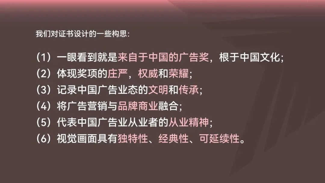 (1)一眼看到就是来自于中国的广告奖,根于中国文化;(2)体现奖项的庄严,权威和荣耀;(3)记录中国广告业态的文明和传承;(4)将广告营销与品牌商业融合;(5)代表中国广告业从业者的从业精神;(6)视觉画面具有独特性、经典性、可延续性。