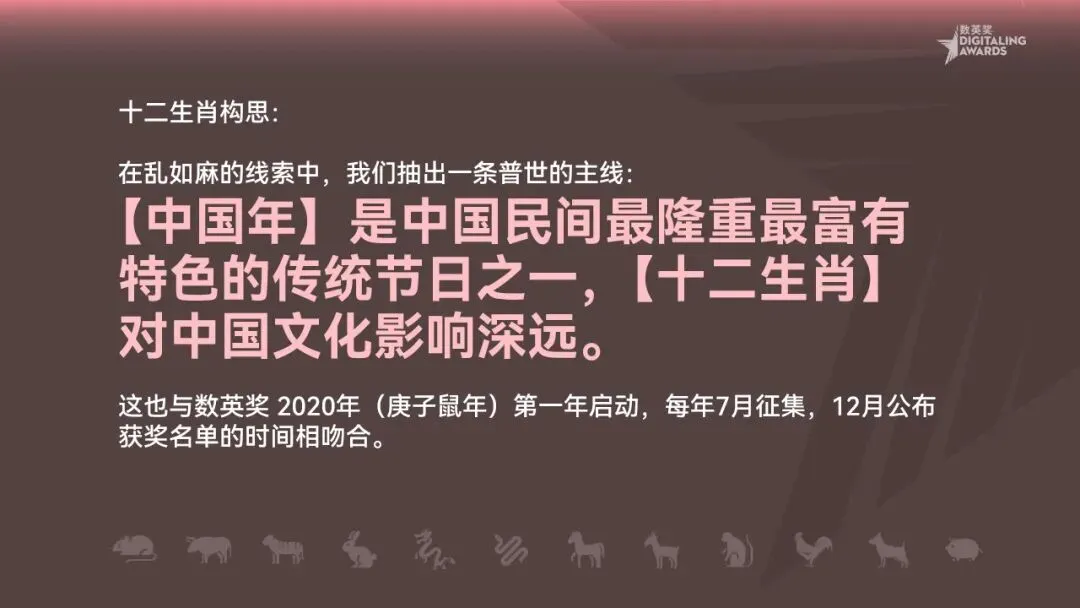 这也与数英奖 2020年(庚子鼠年)为第一年启动,每年7月征集,12月公布获奖名单的时间相吻合。