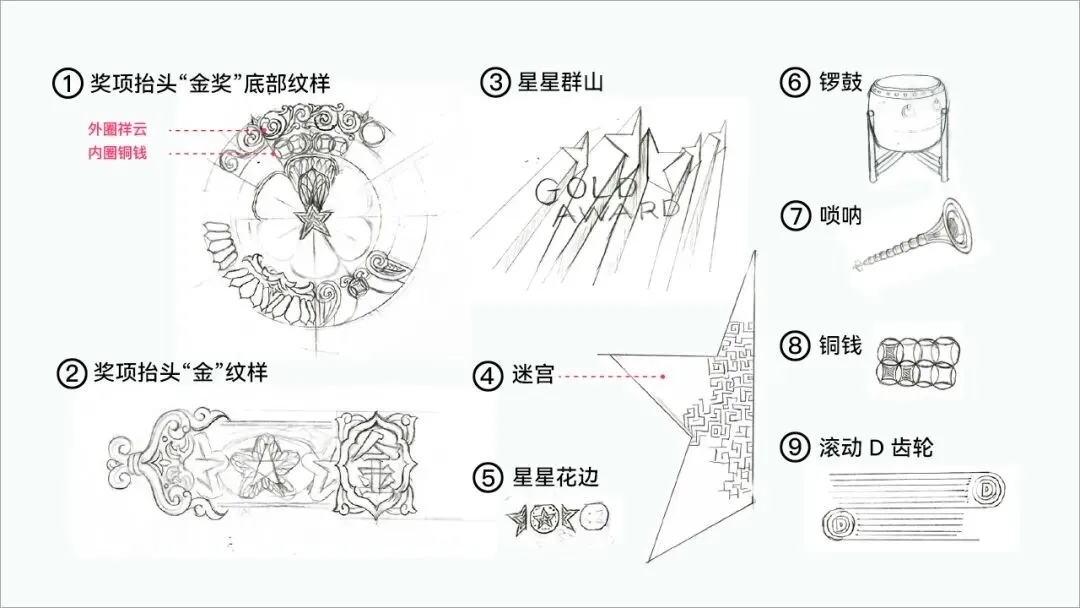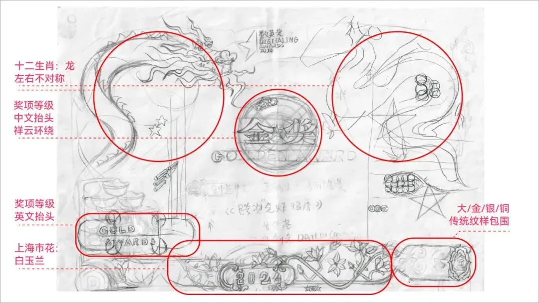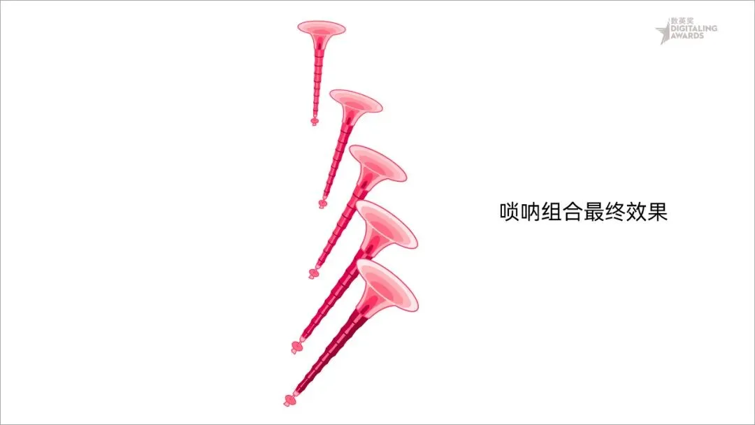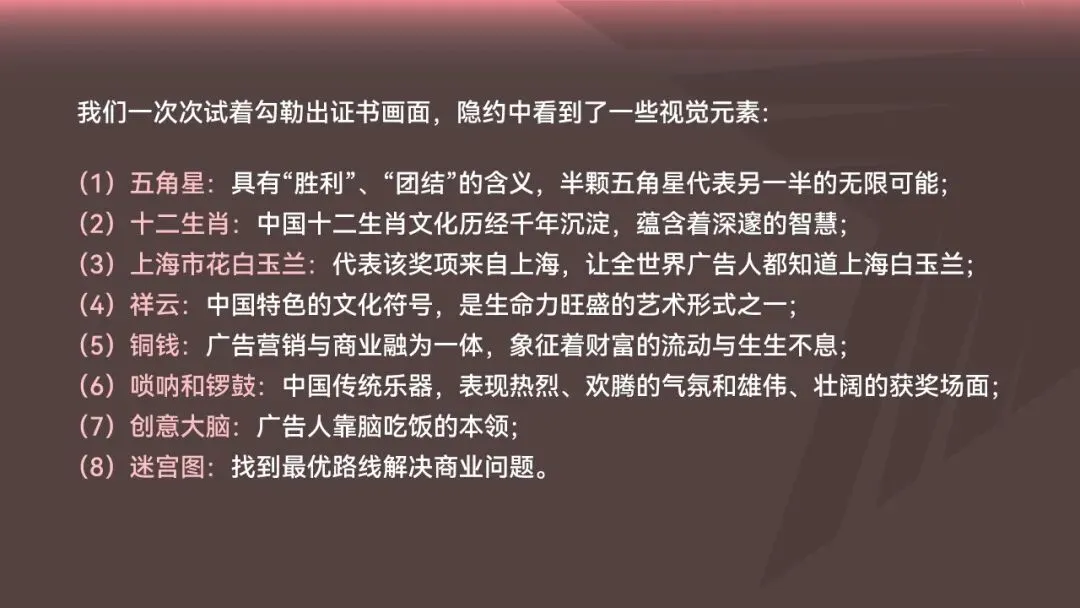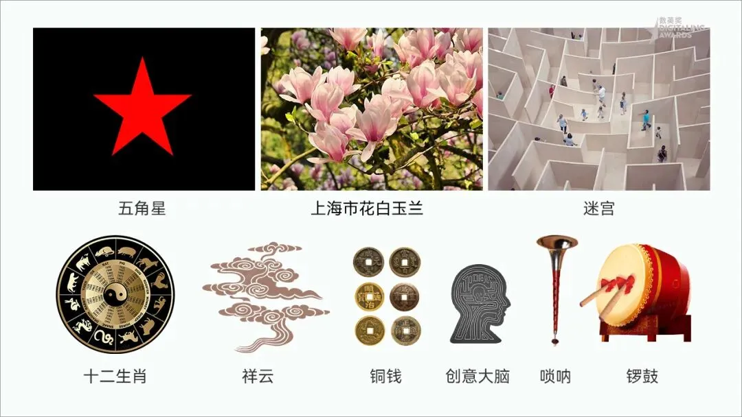 (1)五角星:具有“胜利”、“团结”的含义,半颗五角星代表另一半的无限可能;(2)十二生肖:中国十二生肖文化历经千年沉淀,蕴含着深邃的智慧;(3)上海市花白玉兰:代表该奖项来自上海,让全世界广告人都知道上海白玉兰;(4)祥云:中国特色的文化符号,是生命力旺盛的艺术形式之一;(5)铜钱:广告营销与商业融为一体,象征着财富的流动与生生不息;(6)唢呐和锣鼓:中国传统乐器,表现热烈、欢腾的气氛和雄伟、壮阔的获奖场面;(7)创意大脑:广告人靠脑吃饭的本领;(8)迷宫图:找到最优路线解决商业问题。
